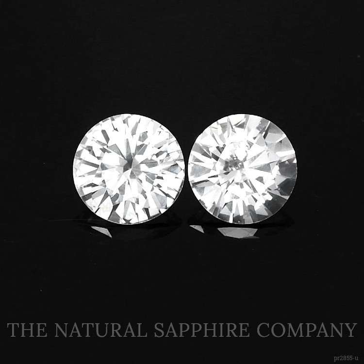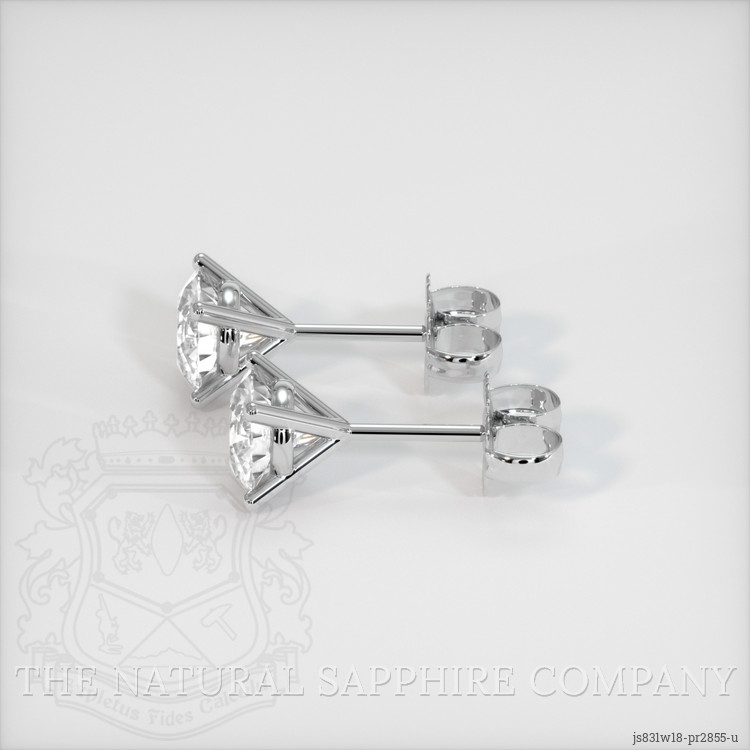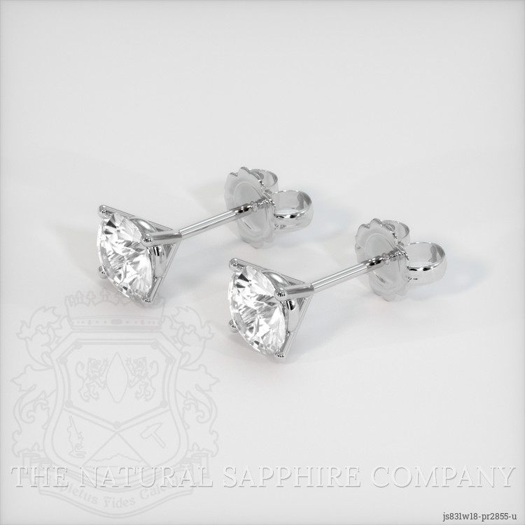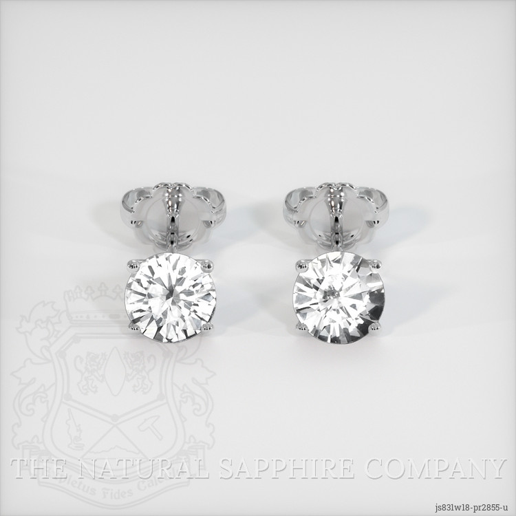 The earrings feature a beautiful, transparent pair of sapphires that are 1.86 total carat weight. They are round shape white sapphires, with the dimensions of 6.10 x 6.00 x 3.70 mm and are mixed brilliant cut, have a clarity grade of very slightly included (evaluated at eye level), colorless color saturation, and an excellent polish. The origin of this pair of sapphires is Ceylon (Sri Lanka).