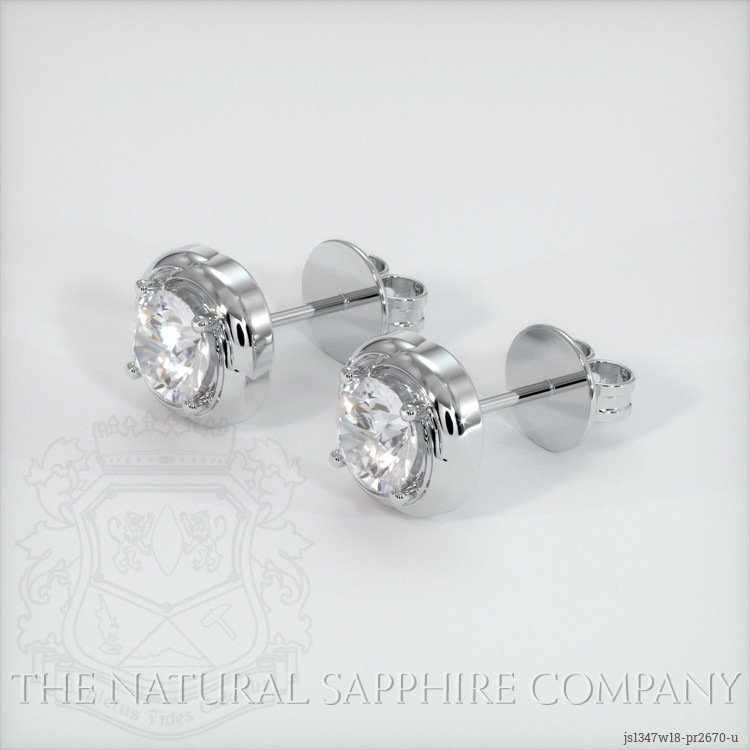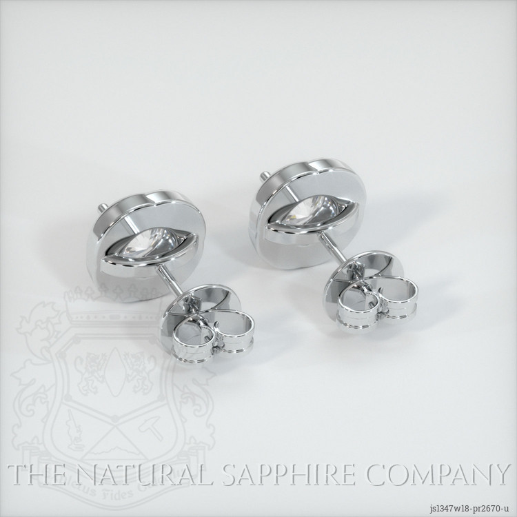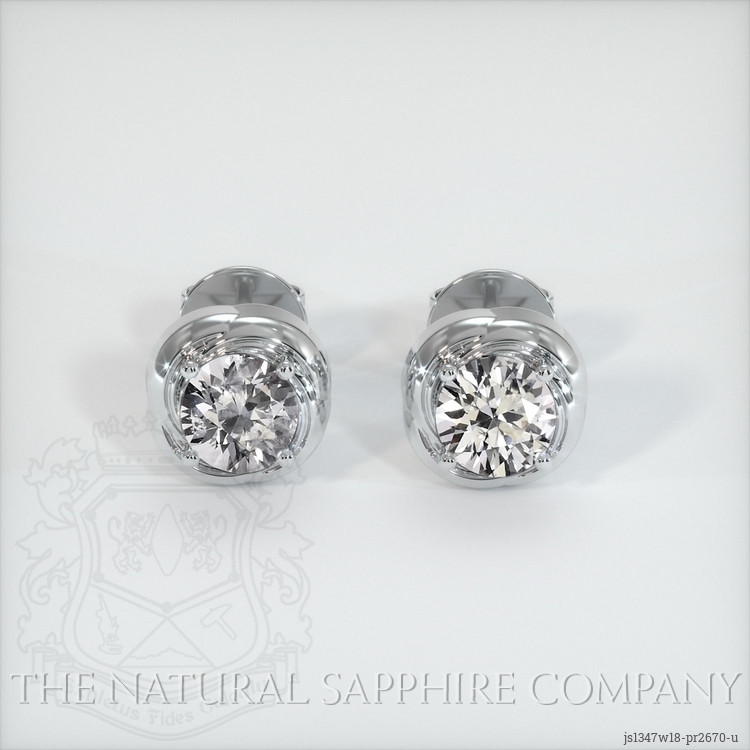 The earrings feature a beautiful, transparent pair of sapphires that are 1.89 total carat weight. They are round shape white sapphires, with the dimensions of 6.11 x 6.01 x 4.11 mm and are mixed brilliant cut, have a clarity grade of very slightly included (evaluated at eye level), colorless color saturation, and an excellent polish. The origin of this pair of sapphires is Ceylon (Sri Lanka).