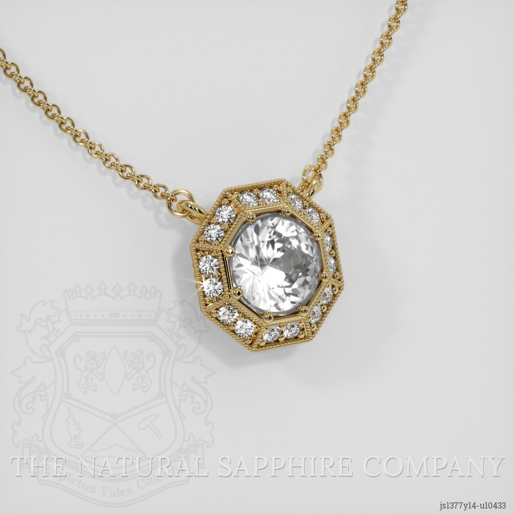 The necklace features a beautiful, transparent 0.54 carat round shape white sapphire with the dimensions of 4.77 x 4.70 x 3.28 mm and a mixed brilliant cut. It has a clarity grade of very slightly included (evaluated at eye level), colorless color saturation, and an excellent polish. The origin of this sapphire is Montana.