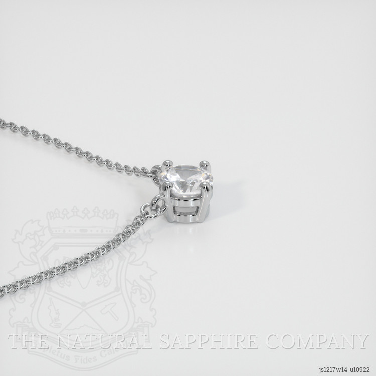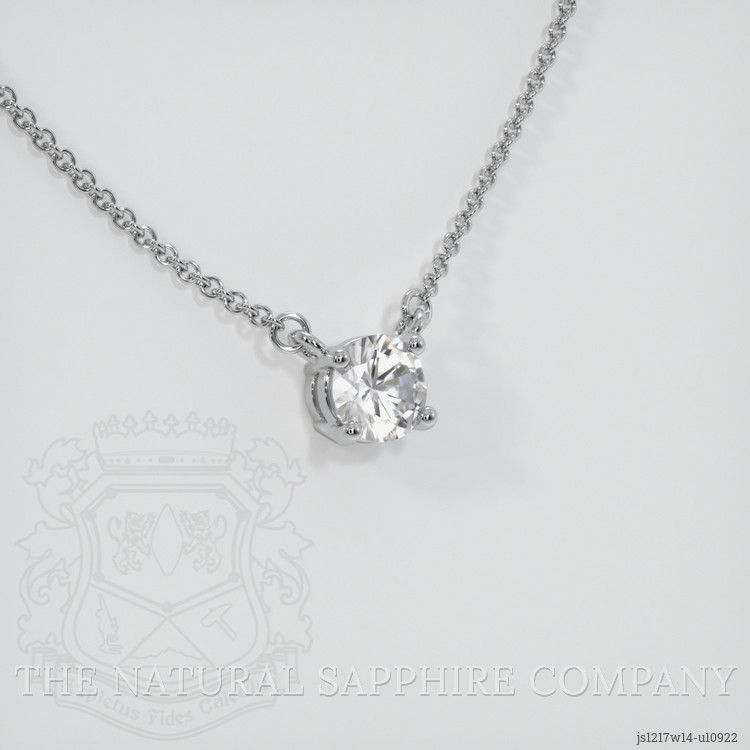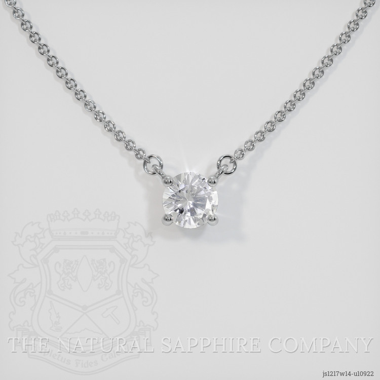 The necklace features a beautiful, transparent 0.84 carat round shape white sapphire with the dimensions of 5.59 x 5.54 x 3.82 mm and a mixed brilliant cut. It has a clarity grade of very slightly included (evaluated at eye level), colorless color saturation, and an excellent polish. The origin of this sapphire is Ceylon (Sri Lanka).