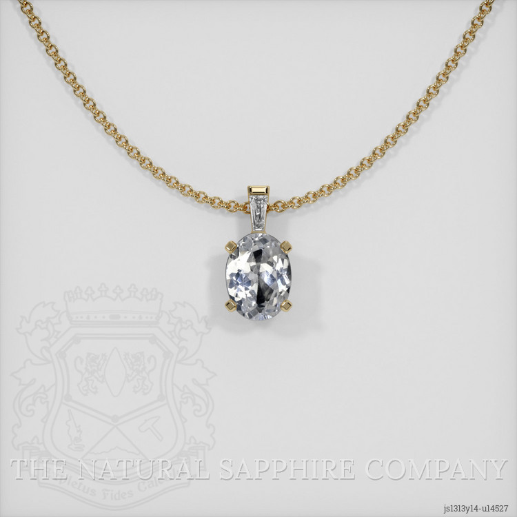 The pendant features a beautiful, transparent 0.92 carat oval shape white sapphire with the dimensions of 6.90 x 5.16 x 3.31 mm and a mixed brilliant cut. It has a clarity grade of very slightly included (evaluated at eye level), colorless color saturation, and an excellent polish. The origin of this sapphire is Ceylon (Sri Lanka).