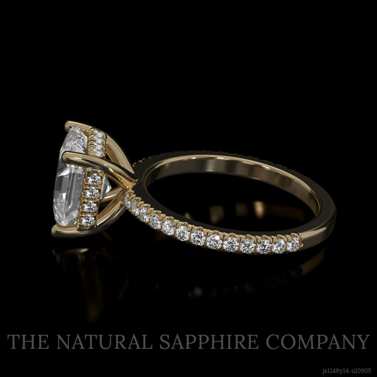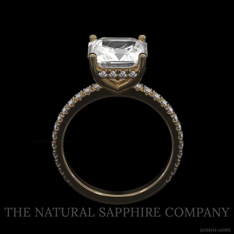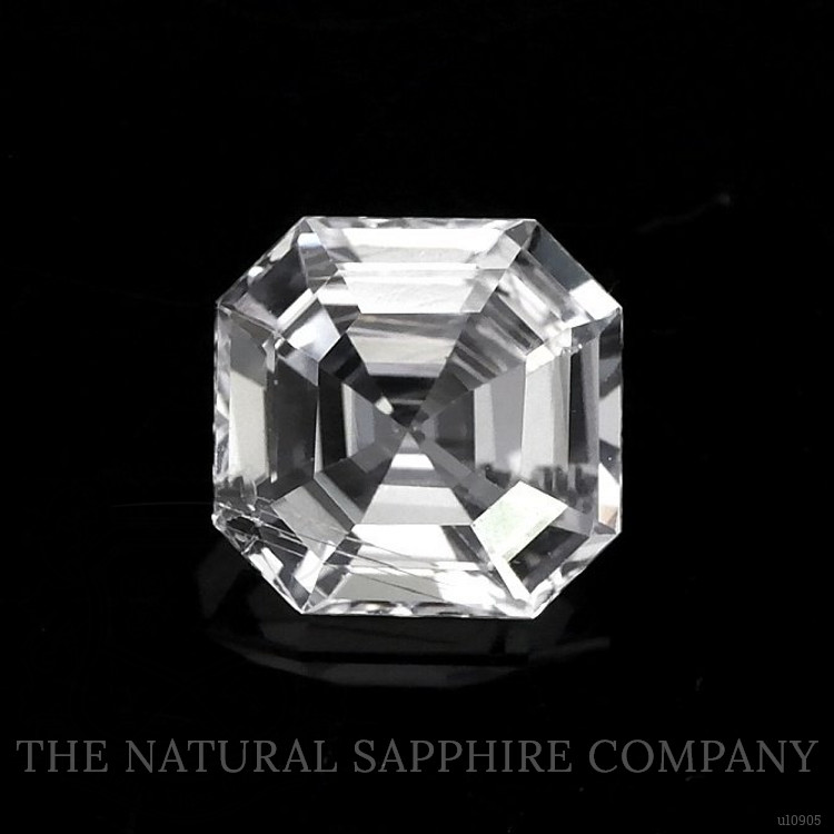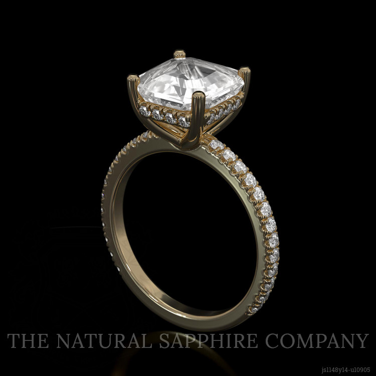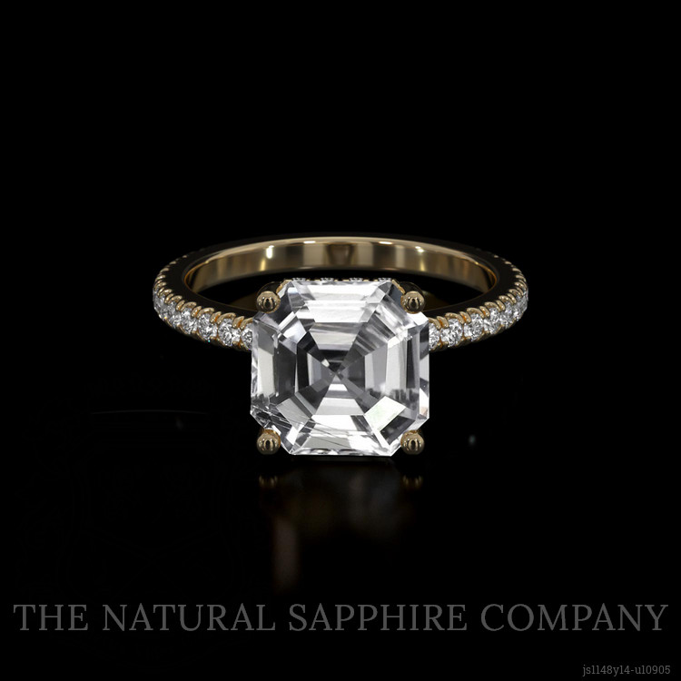The ring features a beautiful, transparent 2.87 carat asscher - octagon shape white sapphire with the dimensions of 8.56 x 8.30 x 4.89 mm and a asscher cut. It has a clarity grade of very slightly included (evaluated at eye level), colorless color saturation, and an excellent polish. The origin of this sapphire is Ceylon (Sri Lanka).