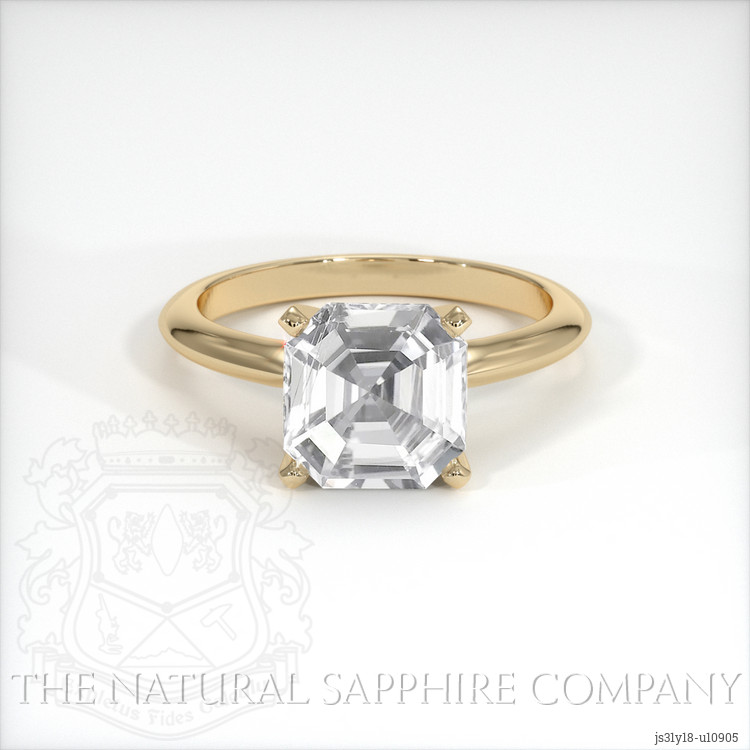 The ring features a beautiful, transparent 2.87 carat asscher - octagon shape white sapphire with the dimensions of 8.56 x 8.30 x 4.89 mm and a asscher cut. It has a clarity grade of very slightly included (evaluated at eye level), colorless color saturation, and an excellent polish. The origin of this sapphire is Ceylon (Sri Lanka).