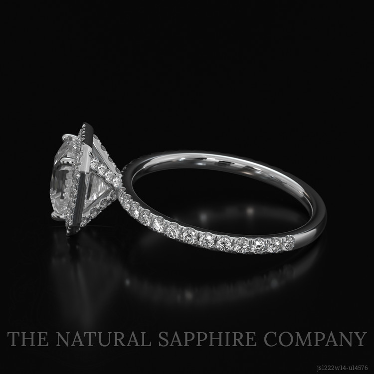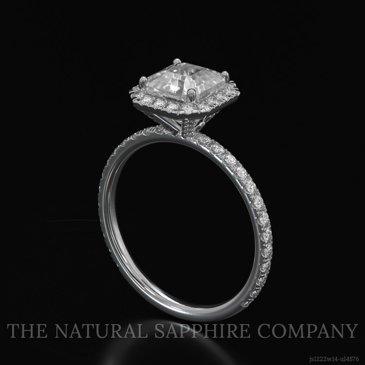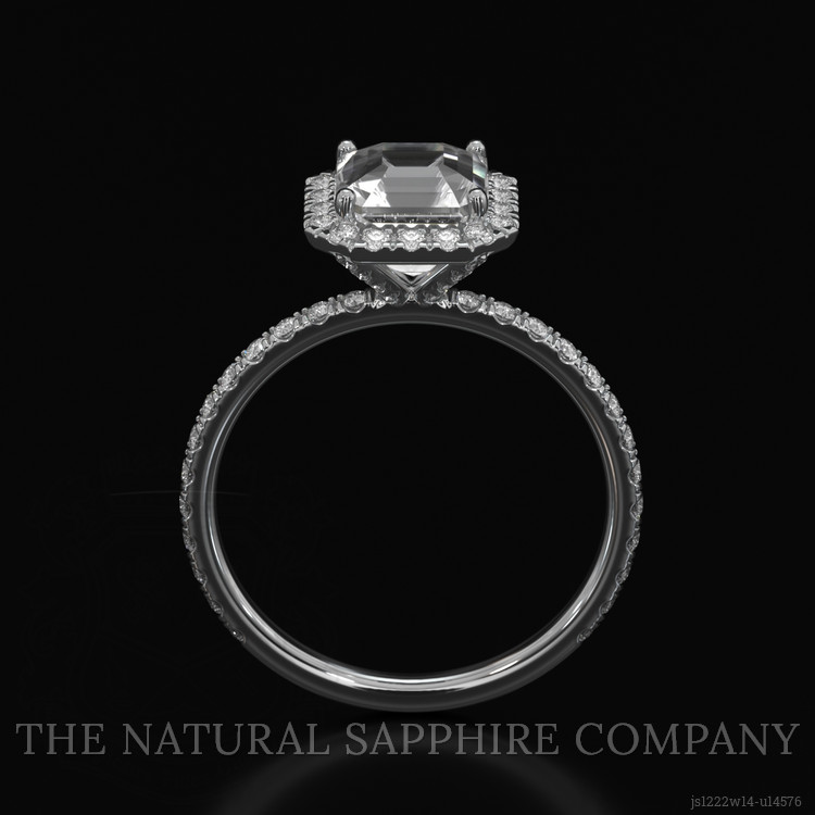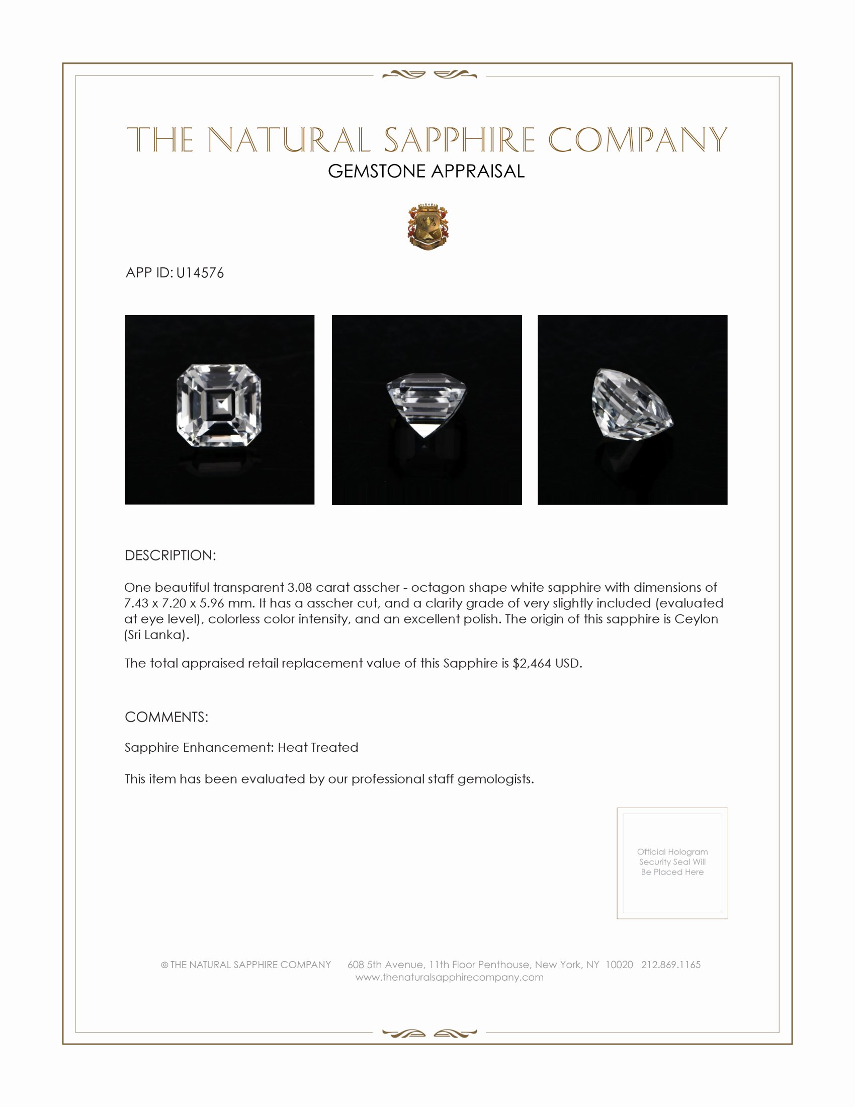 The ring features a beautiful, transparent 3.08 carat asscher - octagon shape white sapphire with the dimensions of 7.43 x 7.20 x 5.96 mm and a asscher cut. It has a clarity grade of very slightly included (evaluated at eye level), colorless color saturation, and an excellent polish. The origin of this sapphire is Ceylon (Sri Lanka).