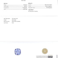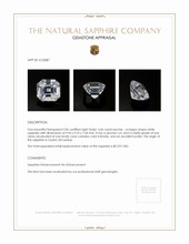The ring features a beautiful, transparent GIA certified Light Violet 6.06 carat asscher - octagon shape white sapphire with the dimensions of 9.96 x 9.25 x 7.44 mm and a asscher cut. It has a clarity grade of eye clean (evaluated at eye level), near colorless color saturation, and an excellent polish. The origin of this sapphire is Ceylon (Sri Lanka).