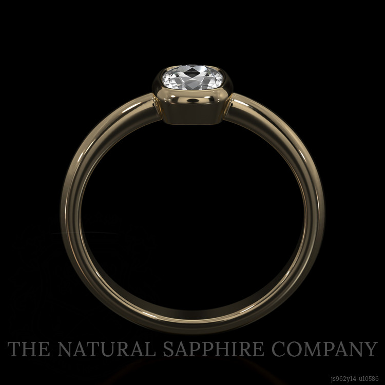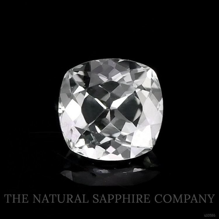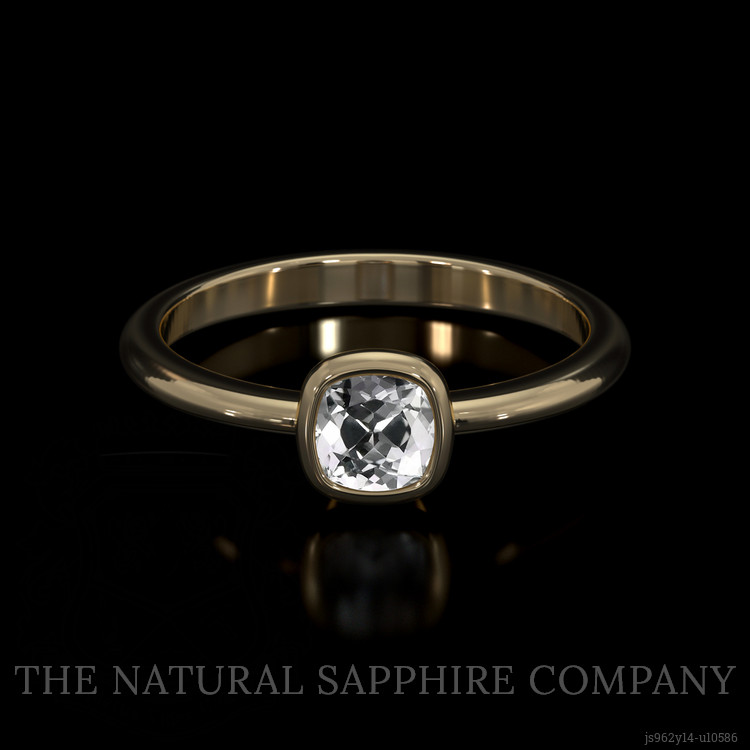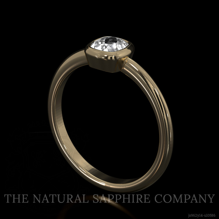 The men's ring features a beautiful, transparent 0.51 carat cushion shape white sapphire with the dimensions of 4.59 x 4.45 x 3.20 mm and a mixed brilliant cut. It has a clarity grade of eye clean (evaluated at eye level), colorless color saturation, and an excellent polish. The origin of this sapphire is Montana.