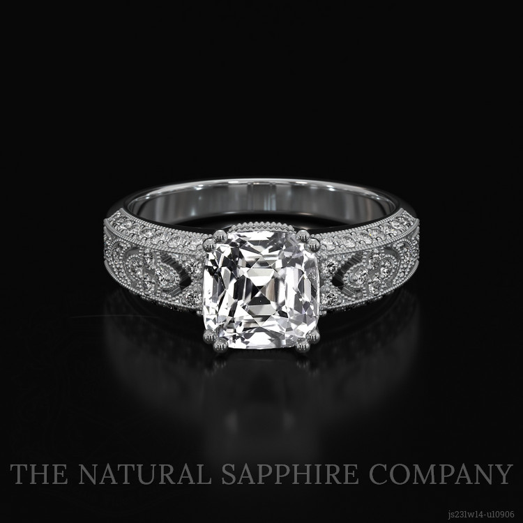 The ring features a beautiful, transparent 2.75 carat cushion shape white sapphire with the dimensions of 7.53 x 7.45 x 5.99 mm and a mixed brilliant cut. It has a clarity grade of very slightly included (evaluated at eye level), colorless color saturation, and an excellent polish. The origin of this sapphire is Ceylon (Sri Lanka).
