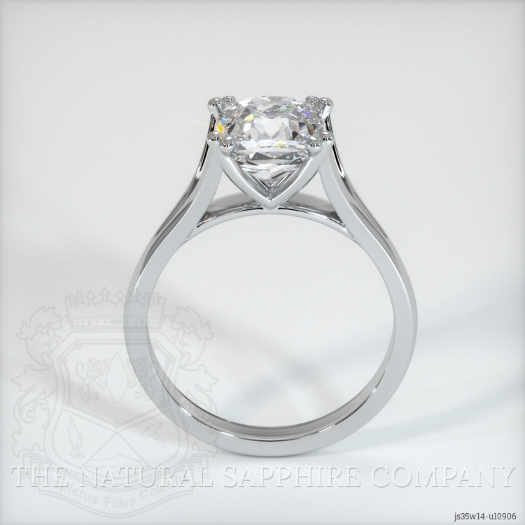 The ring features a beautiful, transparent 2.75 carat cushion shape white sapphire with the dimensions of 7.53 x 7.45 x 5.99 mm and a mixed brilliant cut. It has a clarity grade of very slightly included (evaluated at eye level), colorless color saturation, and an excellent polish. The origin of this sapphire is Ceylon (Sri Lanka).