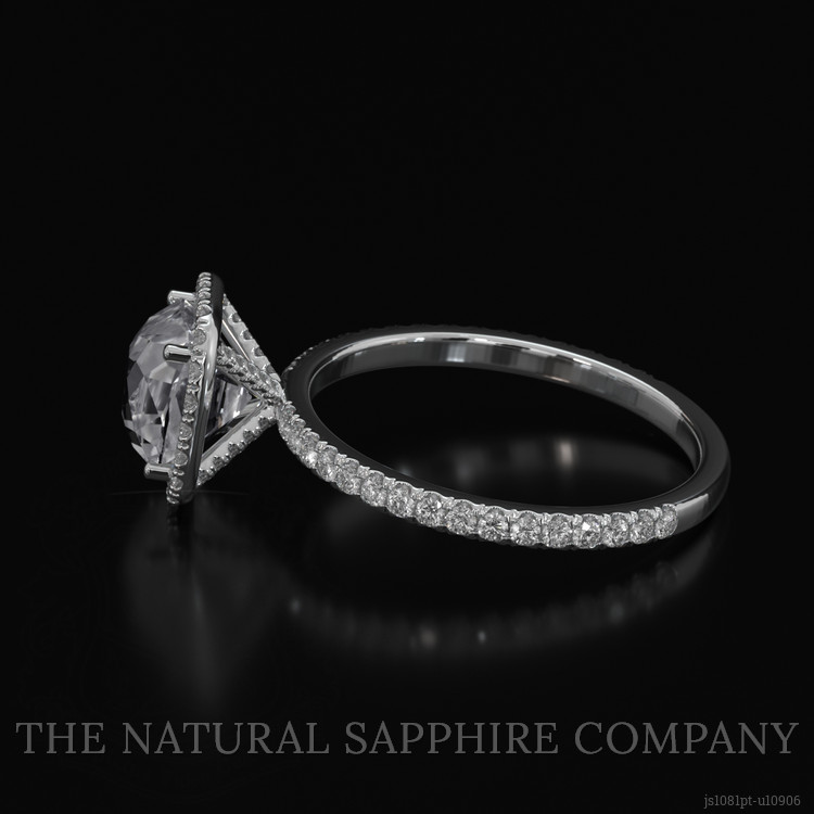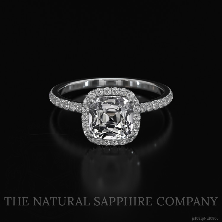 The ring features a beautiful, transparent 2.75 carat cushion shape white sapphire with the dimensions of 7.53 x 7.45 x 5.99 mm and a mixed brilliant cut. It has a clarity grade of very slightly included (evaluated at eye level), colorless color saturation, and an excellent polish. The origin of this sapphire is Ceylon (Sri Lanka).