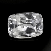 The ring features a beautiful, transparent 3.29 carat cushion shape white sapphire with the dimensions of 10.41 x 7.43 x 4.70 mm and a mixed brilliant cut. It has a clarity grade of slightly included (evaluated at eye level), colorless color saturation, and an excellent polish. The origin of this sapphire is Ceylon (Sri Lanka).