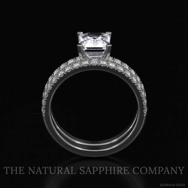 The ring features a beautiful, transparent 1.59 carat emerald cut shape white sapphire with the dimensions of 6.52 x 5.67 x 4.22 mm and a emerald cut. It has a clarity grade of very slightly included (evaluated at eye level), near colorless color saturation, and an excellent polish. The origin of this sapphire is Madagascar.