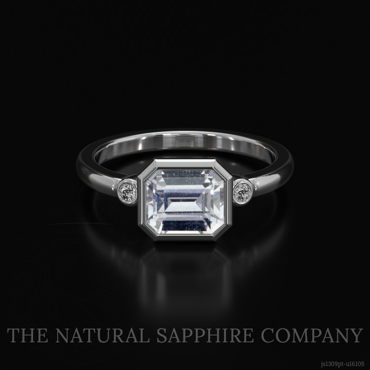The ring features a beautiful, transparent 1.59 carat emerald cut shape white sapphire with the dimensions of 6.52 x 5.67 x 4.22 mm and a emerald cut. It has a clarity grade of very slightly included (evaluated at eye level), near colorless color saturation, and an excellent polish. The origin of this sapphire is Madagascar.