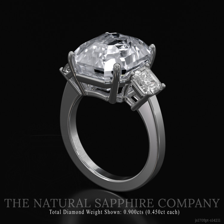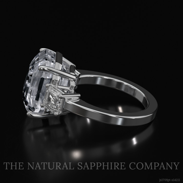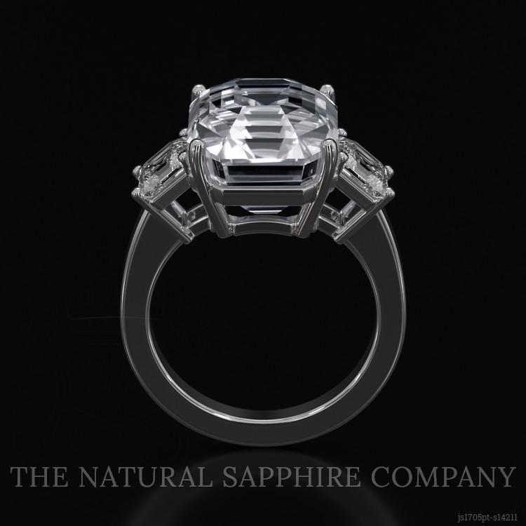 The ring features a beautiful, transparent 10.04 carat emerald cut shape white sapphire with the dimensions of 11.95 x 9.93 x 8.04 mm and a emerald cut. It has a clarity grade of eye clean (evaluated at eye level), colorless color saturation, and an excellent polish. The origin of this sapphire is Ceylon (Sri Lanka).