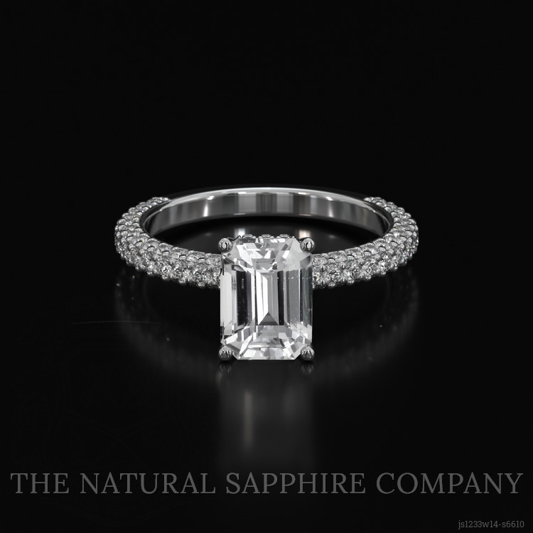 The ring features a beautiful, transparent GIA certified Near Colorless 2.51 carat emerald cut shape white sapphire with the dimensions of 8.35 x 6.32 x 4.82 mm and a emerald cut. It has a clarity grade of very slightly included (evaluated at eye level), near colorless color saturation, and an excellent polish. The origin of this sapphire is Ceylon (Sri Lanka).