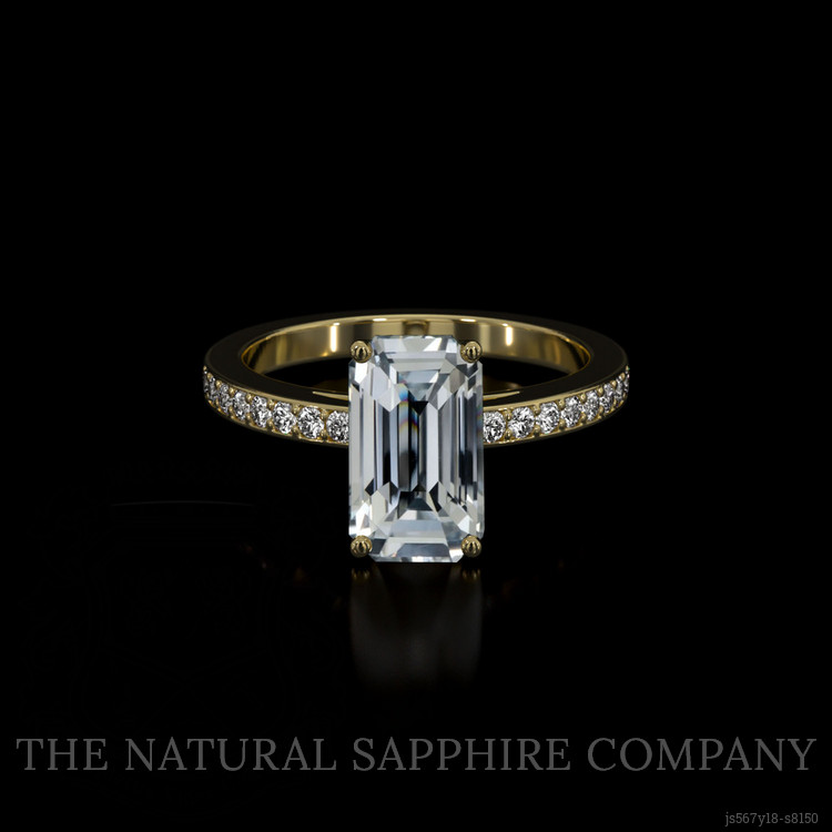The ring features a beautiful, transparent 3.57 carat emerald cut shape white sapphire with the dimensions of 10.73 x 6.35 x 5.02 mm and a emerald cut. It has a clarity grade of eye clean (evaluated at eye level), near colorless color saturation, and an excellent polish. The origin of this sapphire is Ceylon (Sri Lanka).