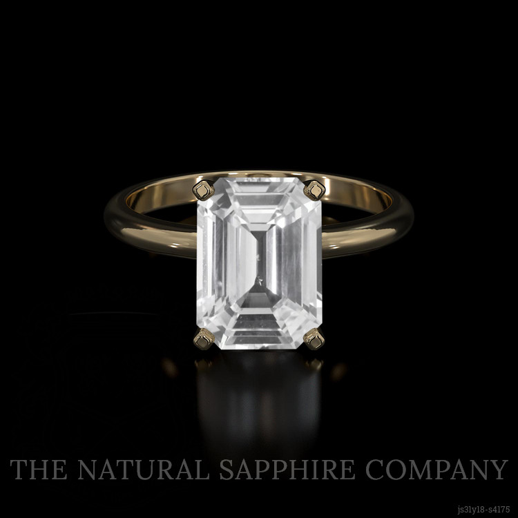 The ring features a beautiful, transparent 4.00 carat emerald cut shape white sapphire with the dimensions of 10.58 x 7.72 x 4.97 mm and a emerald cut. It has a clarity grade of very slightly included (evaluated at eye level), colorless color saturation, and an excellent polish. The origin of this sapphire is Ceylon (Sri Lanka).