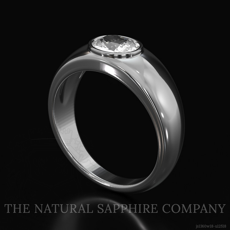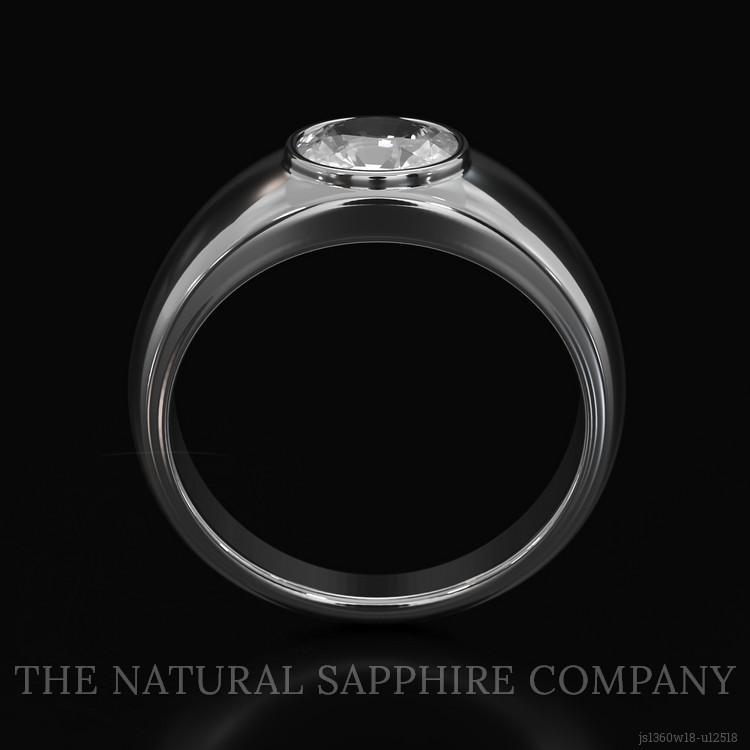 The men's ring features a beautiful, transparent 0.92 carat oval shape white sapphire with the dimensions of 6.63 x 5.68 x 3.05 mm and a mixed brilliant cut. It has a clarity grade of very slightly included (evaluated at eye level), colorless color saturation, and an excellent polish. The origin of this sapphire is Ceylon (Sri Lanka).