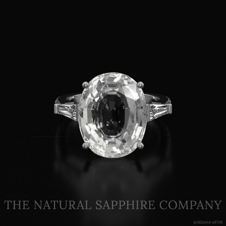 The ring features a beautiful, transparent 11.12 carat oval shape white sapphire with the dimensions of 14.34 x 11.61 x 7.05 mm and a mixed brilliant cut. It has a clarity grade of very slightly included (evaluated at eye level), colorless color saturation, and an excellent polish. The origin of this sapphire is Ceylon (Sri Lanka).
