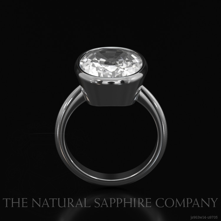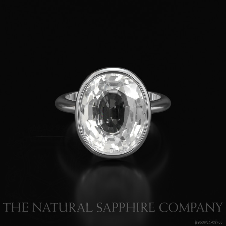 The men's ring features a beautiful, transparent 11.12 carat oval shape white sapphire with the dimensions of 14.34 x 11.61 x 7.05 mm and a mixed brilliant cut. It has a clarity grade of very slightly included (evaluated at eye level), colorless color saturation, and an excellent polish. Enhancement: heat treated. The origin of this sapphire is Ceylon (Sri Lanka).