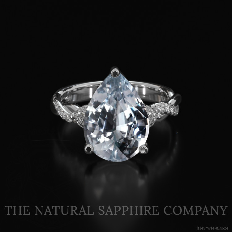The ring features a beautiful, transparent 6.83 carat pear shape white sapphire with the dimensions of 14.32 x 10.22 x 6.45 mm and a mixed brilliant cut. It has a clarity grade of very slightly included (evaluated at eye level), near colorless color saturation, and an excellent polish. The origin of this sapphire is Ceylon (Sri Lanka).