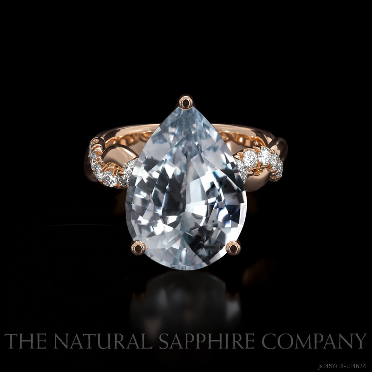 The ring features a beautiful, transparent 6.83 carat pear shape white sapphire with the dimensions of 14.32 x 10.22 x 6.45 mm and a mixed brilliant cut. It has a clarity grade of very slightly included (evaluated at eye level), near colorless color saturation, and an excellent polish. The origin of this sapphire is Ceylon (Sri Lanka).