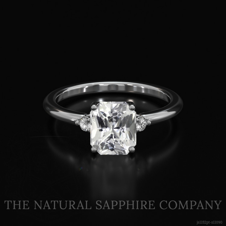The ring features a beautiful, transparent 2.12 carat radiant shape white sapphire with the dimensions of 7.46 x 6.49 x 4.88 mm and a radiant cut. It has a clarity grade of very slightly included (evaluated at eye level), colorless color saturation, and an excellent polish. The origin of this sapphire is Ceylon (Sri Lanka).