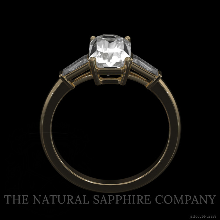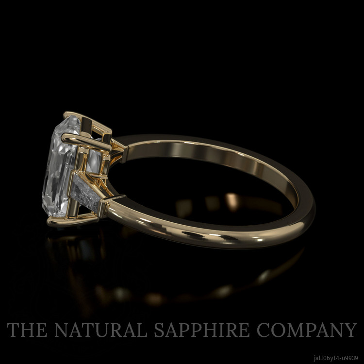 The ring features a beautiful, transparent 3.16 carat radiant shape white sapphire with the dimensions of 9.61 x 6.38 x 5.42 mm and a radiant cut. It has a clarity grade of very slightly included (evaluated at eye level), near colorless color saturation, and an excellent polish. The origin of this sapphire is Ceylon (Sri Lanka).