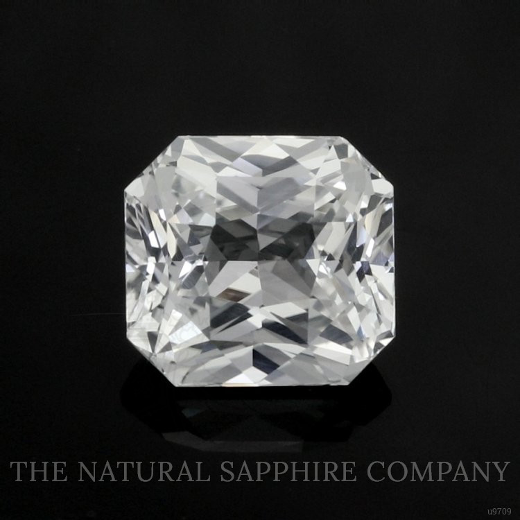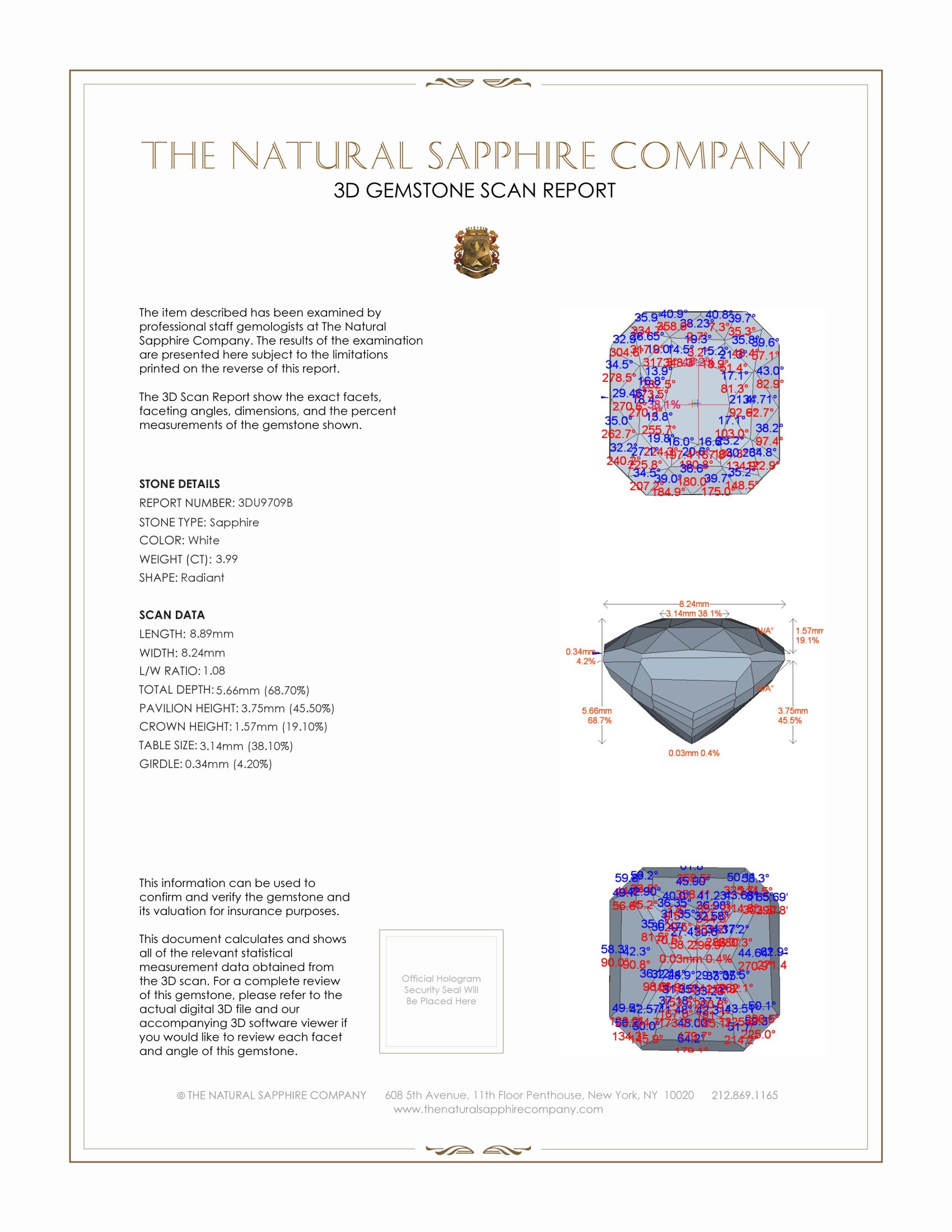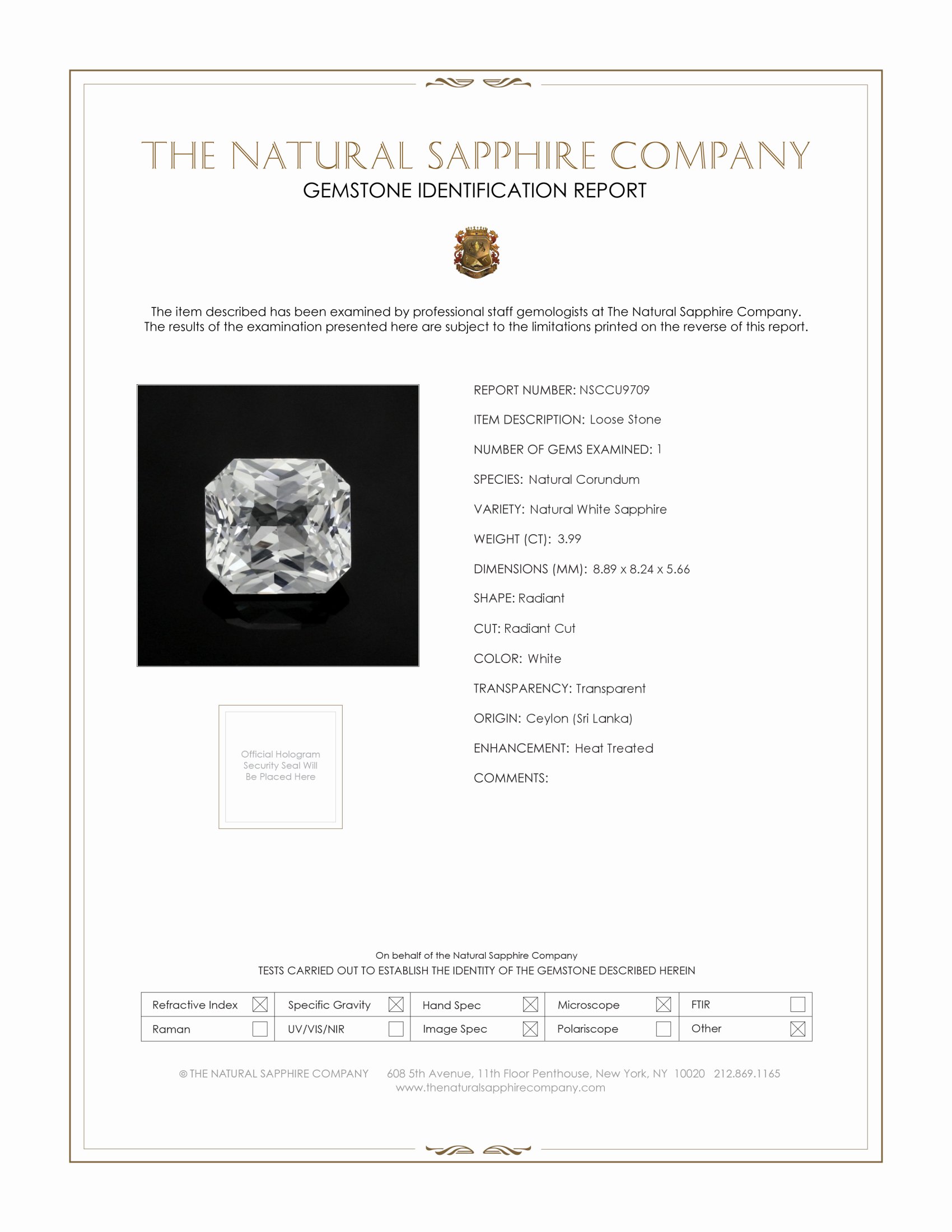 The ring features a beautiful, transparent 3.99 carat radiant shape white sapphire with the dimensions of 8.89 x 8.24 x 5.66 mm and a radiant cut. It has a clarity grade of eye clean (evaluated at eye level), colorless color saturation, and an excellent polish. The origin of this sapphire is Ceylon (Sri Lanka).