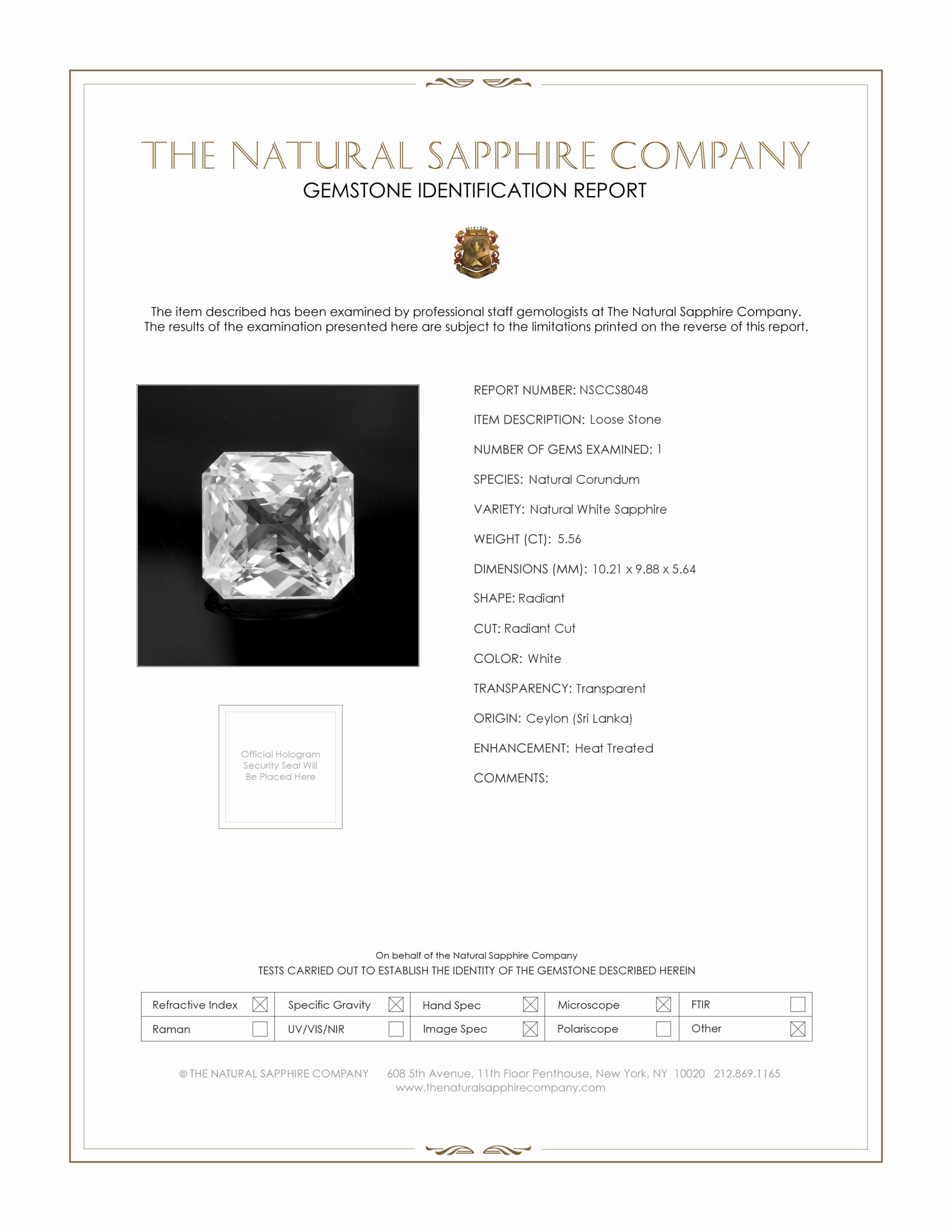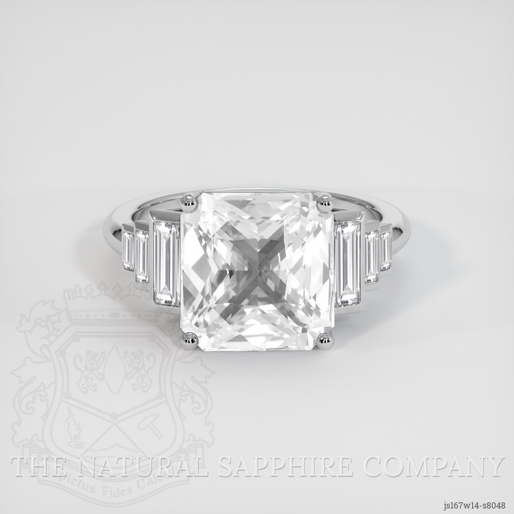 A singular study in precision and purity, this ring centers on a magnificent 5.56 carat radiant shape white sapphire, measured at 10.21 x 9.88 x 5.64 mm, whose faceting has been executed with exceptional technical discipline to maximize brilliance and return. Each cut plane has been calibrated to an exacting geometry, producing crisp pavilion and crown relationships that yield clean light return and a scintillating, almost architectural play of facets. The stone presents as colorless with a clarity grade eye clean evaluated at eye level, and an excellent polish that enhances every facet edge. Heat treated to stabilize and perfect its optical properties, this Ceylon Sri Lanka origin sapphire is a rare white specimen that reads as refined and contemporary, while its radiant cut balances the square silhouette with softened, luminous corners for a look that is both bold and sophisticated.