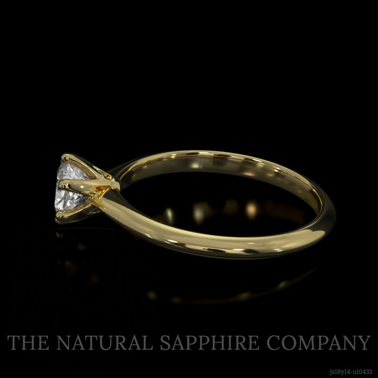 The ring features a beautiful, transparent 0.54 carat round shape white sapphire with the dimensions of 4.77 x 4.70 x 3.28 mm and a mixed brilliant cut. It has a clarity grade of very slightly included (evaluated at eye level), colorless color saturation, and an excellent polish. The origin of this sapphire is Montana.