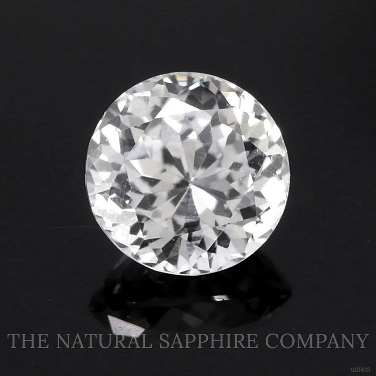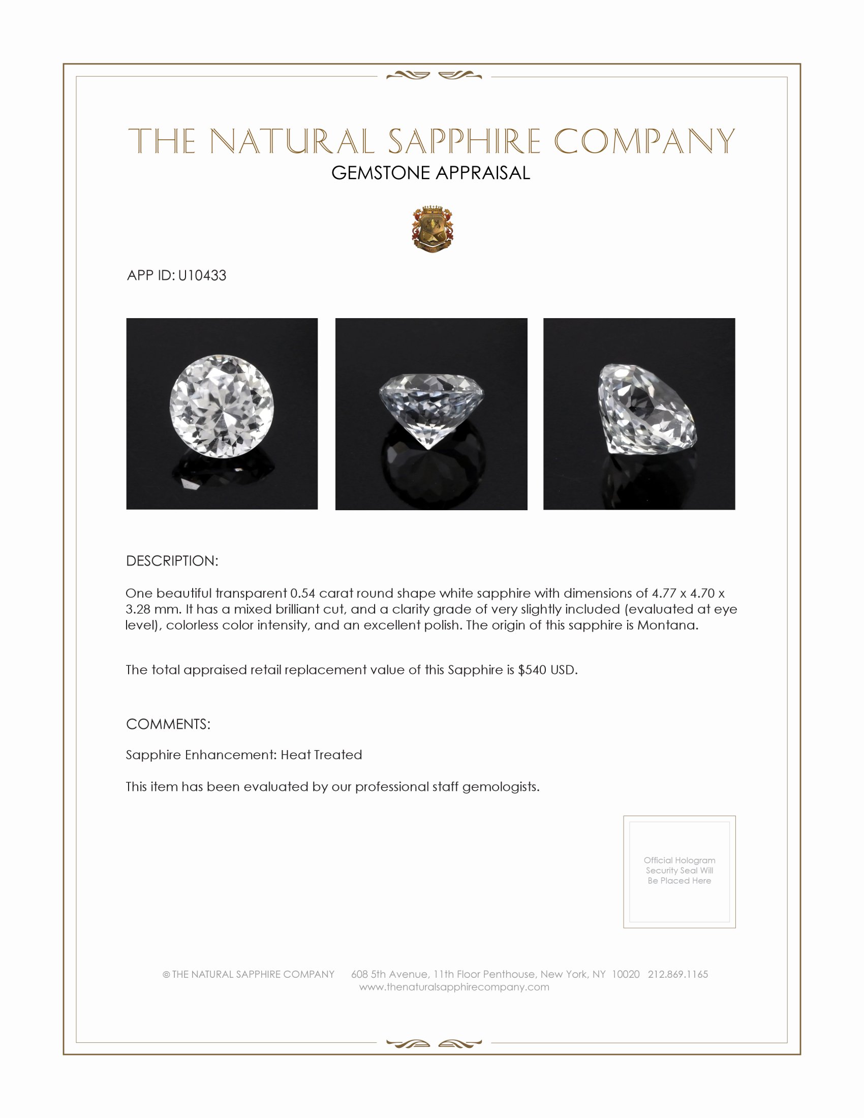 The ring features a beautiful, transparent 0.54 carat round shape white sapphire with the dimensions of 4.77 x 4.70 x 3.28 mm and a mixed brilliant cut. It has a clarity grade of very slightly included (evaluated at eye level), colorless color saturation, and an excellent polish. The origin of this sapphire is Montana.