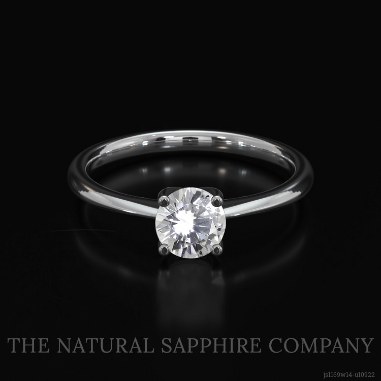 The ring features a beautiful, transparent 0.70 carat round shape white sapphire with the dimensions of 5.56 x 5.56 x 3.26 mm and a brilliant cut. It has a clarity grade of very slightly included (evaluated at eye level), colorless color saturation, and an excellent polish. The origin of this sapphire is Ceylon(Sri Lanka).