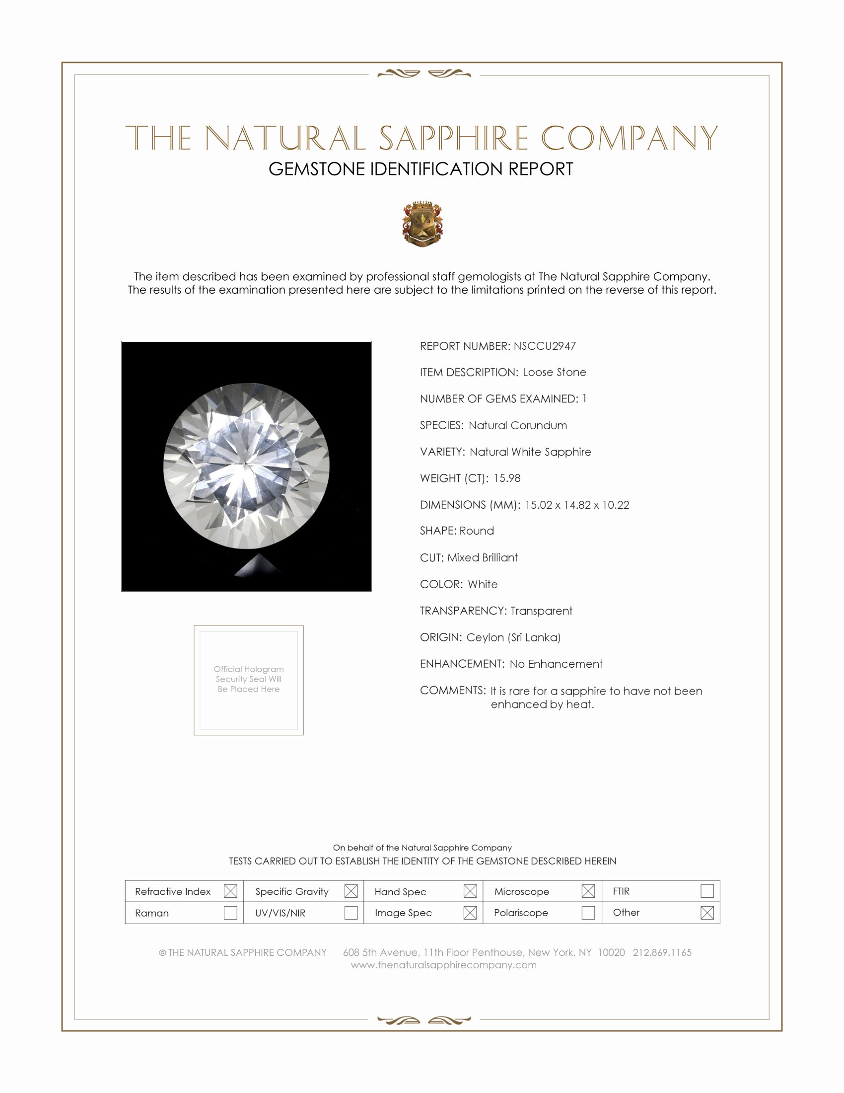 This ring is centered on a magnificent, GIA certified white sapphire weighing 15.98 carats, a gem whose provenance is as integral to its beauty as its brilliance. Hailing from Ceylon, Sri Lanka, this round mixed brilliant cut stone measures 15.02 x 14.82 x 10.22 mm, and displays a near colorless saturation with very slight inclusions when evaluated at eye level, and an excellent polish. That the sapphire is entirely without enhancement preserves its natural story, connecting the wearer to centuries of Ceylonese gem lore, a lineage of sapphires prized by kings and connoisseurs for their clarity and light. The mixed brilliant cut amplifies its transparent character, allowing light to travel through the crystal with an animated, luminous depth that speaks to both geological rarity and careful cutting practice.