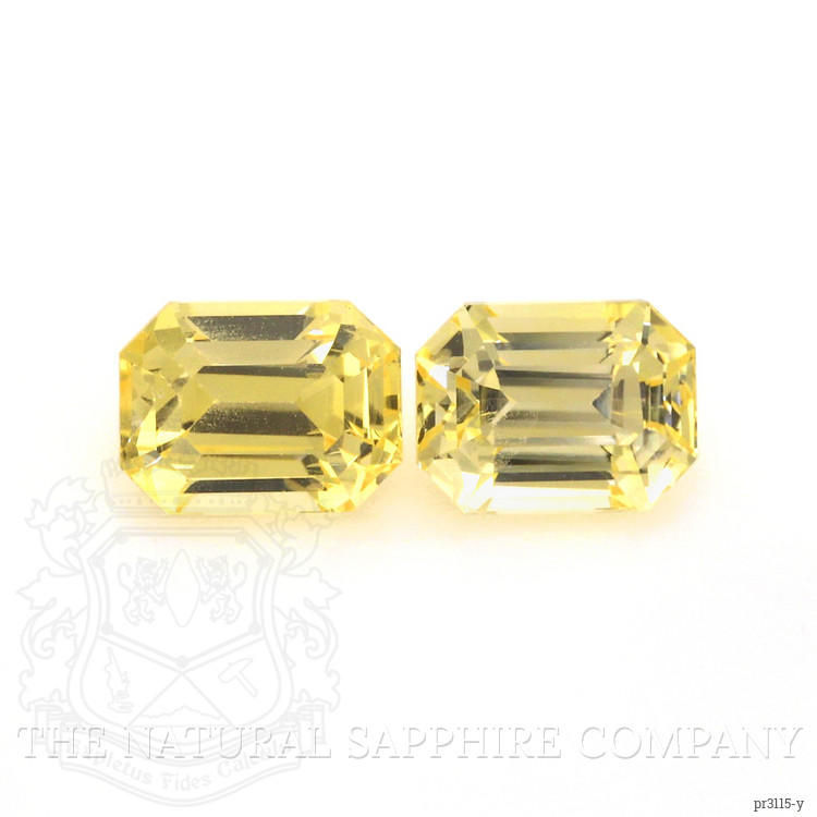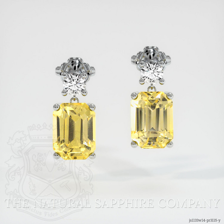 The earrings feature a beautiful, transparent pair of sapphires that are 6.07 total carat weight. They are emerald cut shape yellow sapphires, with the dimensions of 8.44 x 6.39 x 5.68 mm and are step cut, have a clarity grade of eye clean (evaluated at eye level), medium intense color saturation, and an excellent polish. The origin of this pair of sapphires is Ceylon(Sri Lanka).