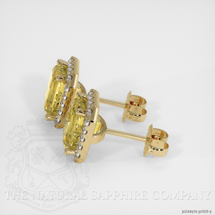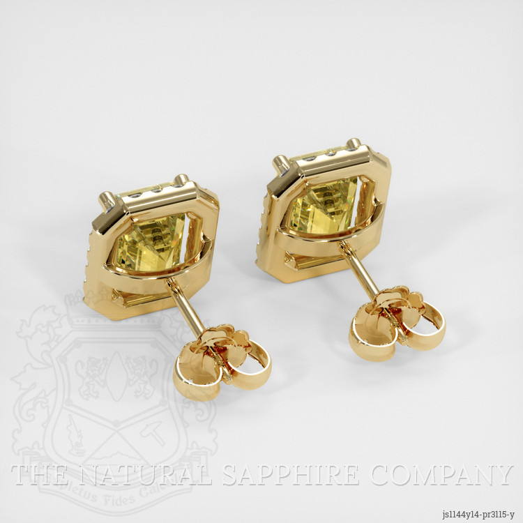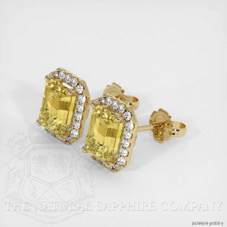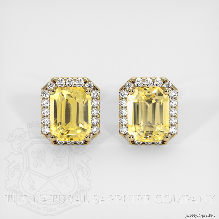 The earrings feature a beautiful, transparent GIA certified pair of sapphires that are 6.07 total carat weight. They are emerald cut shape yellow sapphires, with the dimensions of 8.44 x 6.39 x 5.68 mm and are step cut, have a clarity grade of eye clean (evaluated at eye level), medium intense color saturation, and an excellent polish. The origin of this pair of sapphires is Ceylon (Sri Lanka).