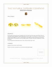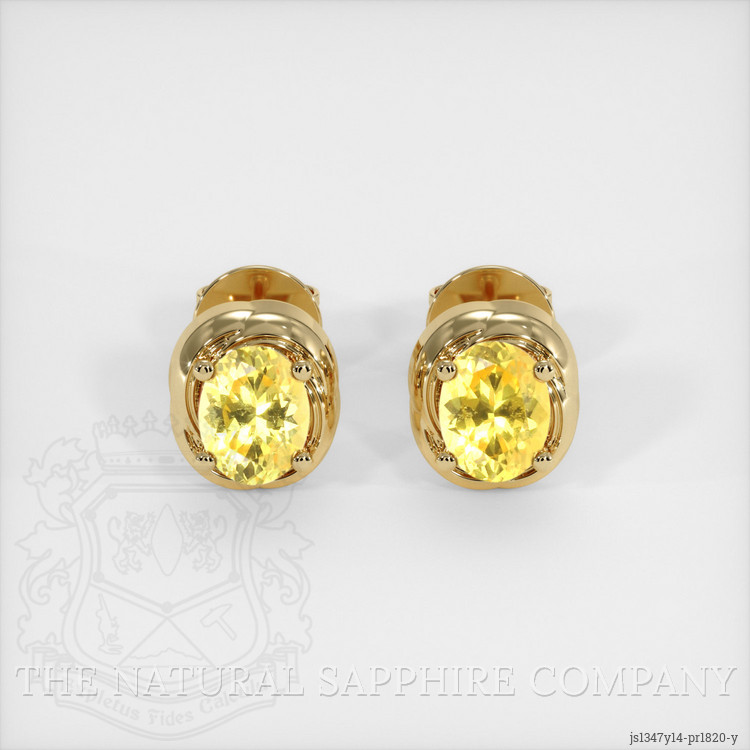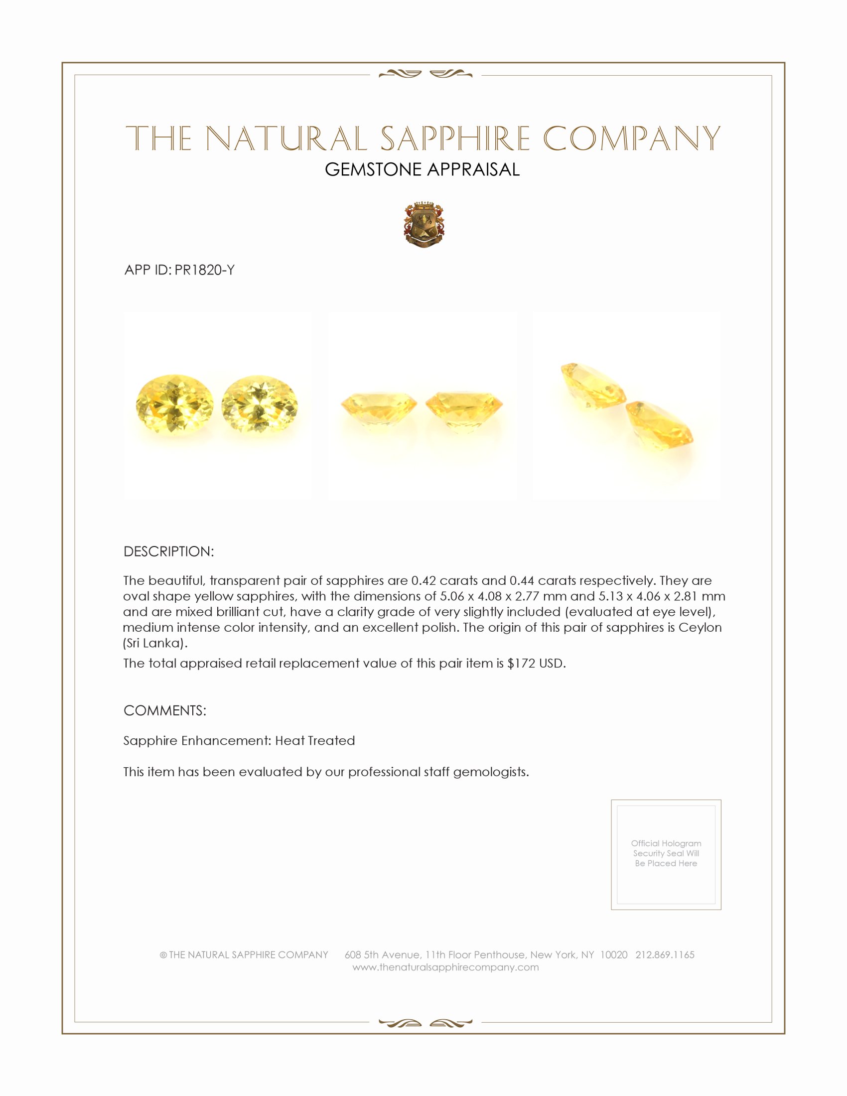 The earrings feature a beautiful, transparent pair of sapphires that are 0.86 total carat weight. They are oval shape yellow sapphires, with the dimensions of 5.13 x 4.06 x 2.81 mm and are mixed brilliant cut, have a clarity grade of very slightly included (evaluated at eye level), medium intense color saturation, and an excellent polish. The origin of this pair of sapphires is Ceylon (Sri Lanka).