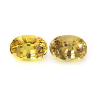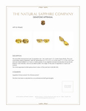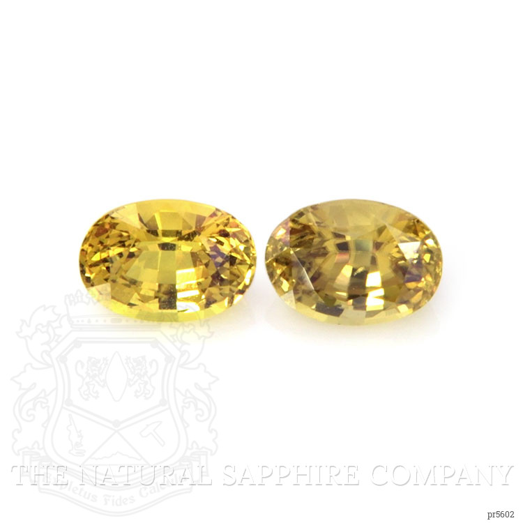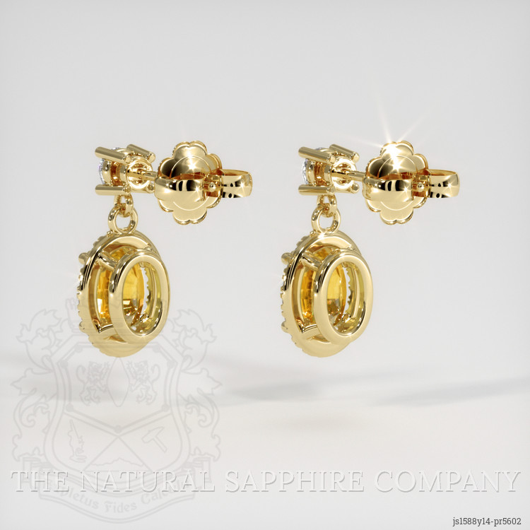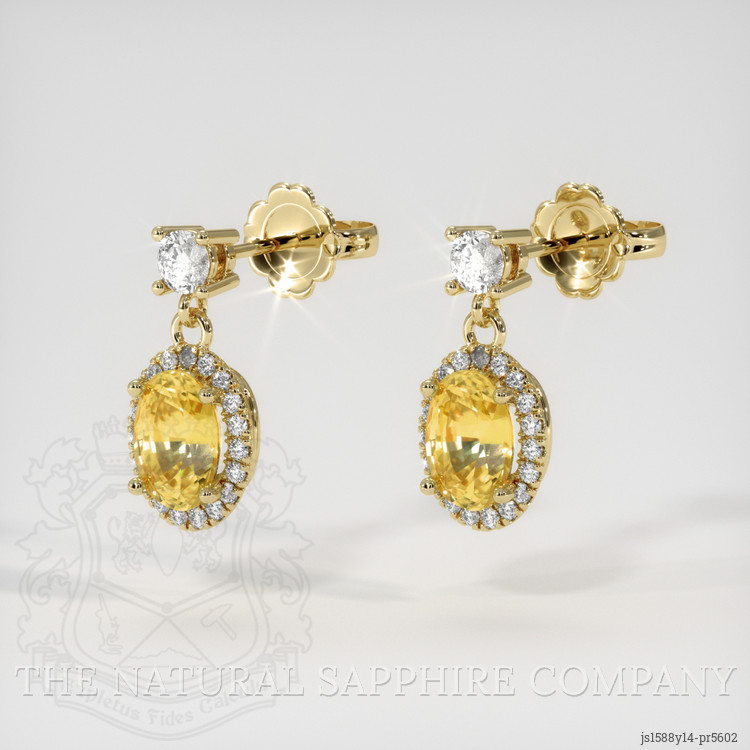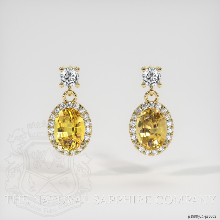 The earrings feature a beautiful, transparent pair of sapphires that are 2.65 total carat weight. They are oval shape yellow sapphires, with the dimensions of 7.12 x 5.21 x 4.14 mm and are mixed brilliant cut, have a clarity grade of very slightly included (evaluated at eye level), intense color saturation, and an excellent polish. The origin of this pair of sapphires is Ceylon (Sri Lanka).