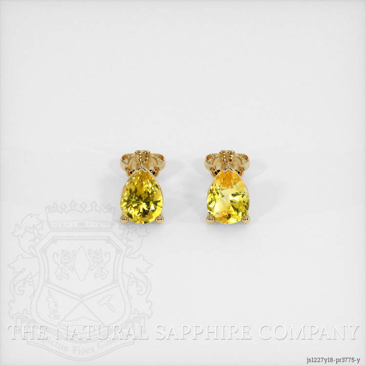 The earrings feature a beautiful, transparent pair of sapphires that are 1.57 total carat weight. They are pear shape yellow sapphires, with the dimensions of 6.96 x 5.16 x 3.78 mm and are mixed brilliant cut, have a clarity grade of eye clean (evaluated at eye level), medium intense color saturation, and an excellent polish. The origin of this pair of sapphires is Ceylon (Sri Lanka).