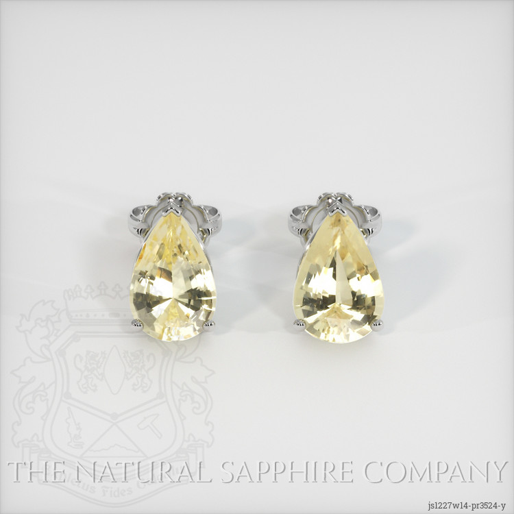 The earrings feature a beautiful, transparent pair of sapphires that are 3.00 total carat weight. They are pear shape yellow sapphires, with the dimensions of 9.44 x 6.09 x 3.90 mm and are mixed brilliant cut, have a clarity grade of eye clean (evaluated at eye level), medium light color saturation, and an excellent polish. The origin of this pair of sapphires is Ceylon (Sri Lanka).