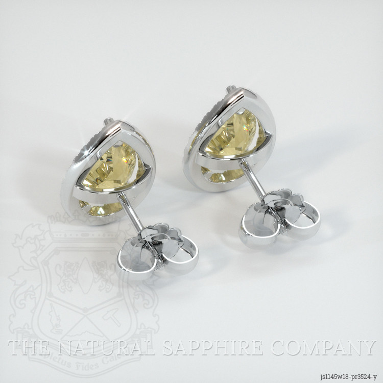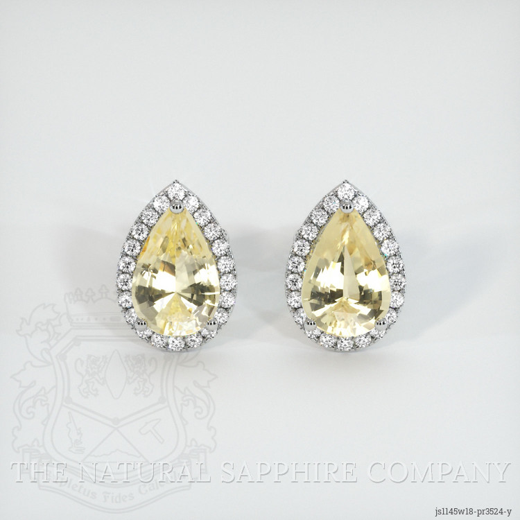 The earrings feature a beautiful, transparent pair of sapphires that are 3.00 total carat weight. They are pear shape yellow sapphires, with the dimensions of 9.44 x 6.09 x 3.90 mm and are mixed brilliant cut, have a clarity grade of eye clean (evaluated at eye level), medium light color saturation, and an excellent polish. The origin of this pair of sapphires is Ceylon (Sri Lanka).