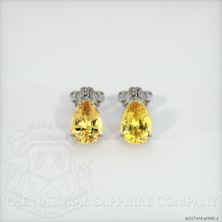 The earrings feature a beautiful, transparent pair of sapphires that are 3.23 total carat weight. They are pear shape yellow sapphires, with the dimensions of 8.86 x 5.93 x 4.28 mm and are mixed brilliant cut, have a clarity grade of very slightly included (evaluated at eye level), intense color saturation, and an excellent polish. The origin of this pair of sapphires is Ceylon (Sri Lanka).