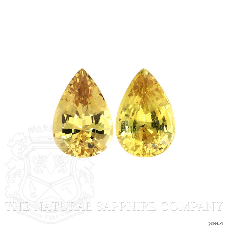 The earrings feature a beautiful, transparent pair of sapphires that are 3.23 total carat weight. They are pear shape yellow sapphires, with the dimensions of 8.86 x 5.93 x 4.28 mm and are mixed brilliant cut, have a clarity grade of very slightly included (evaluated at eye level), intense color saturation, and an excellent polish. The origin of this pair of sapphires is Ceylon (Sri Lanka).