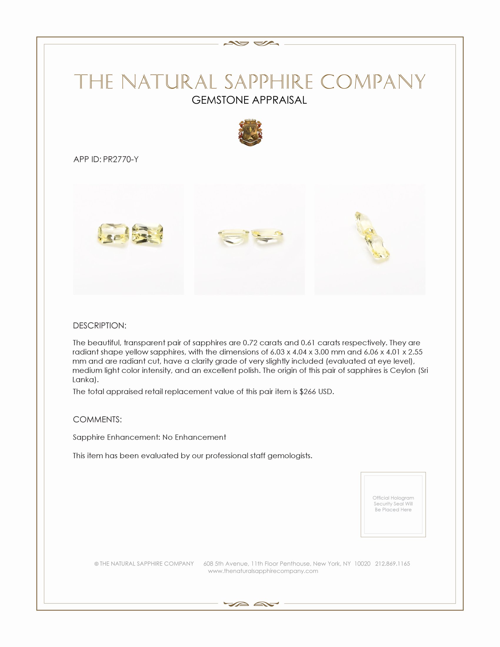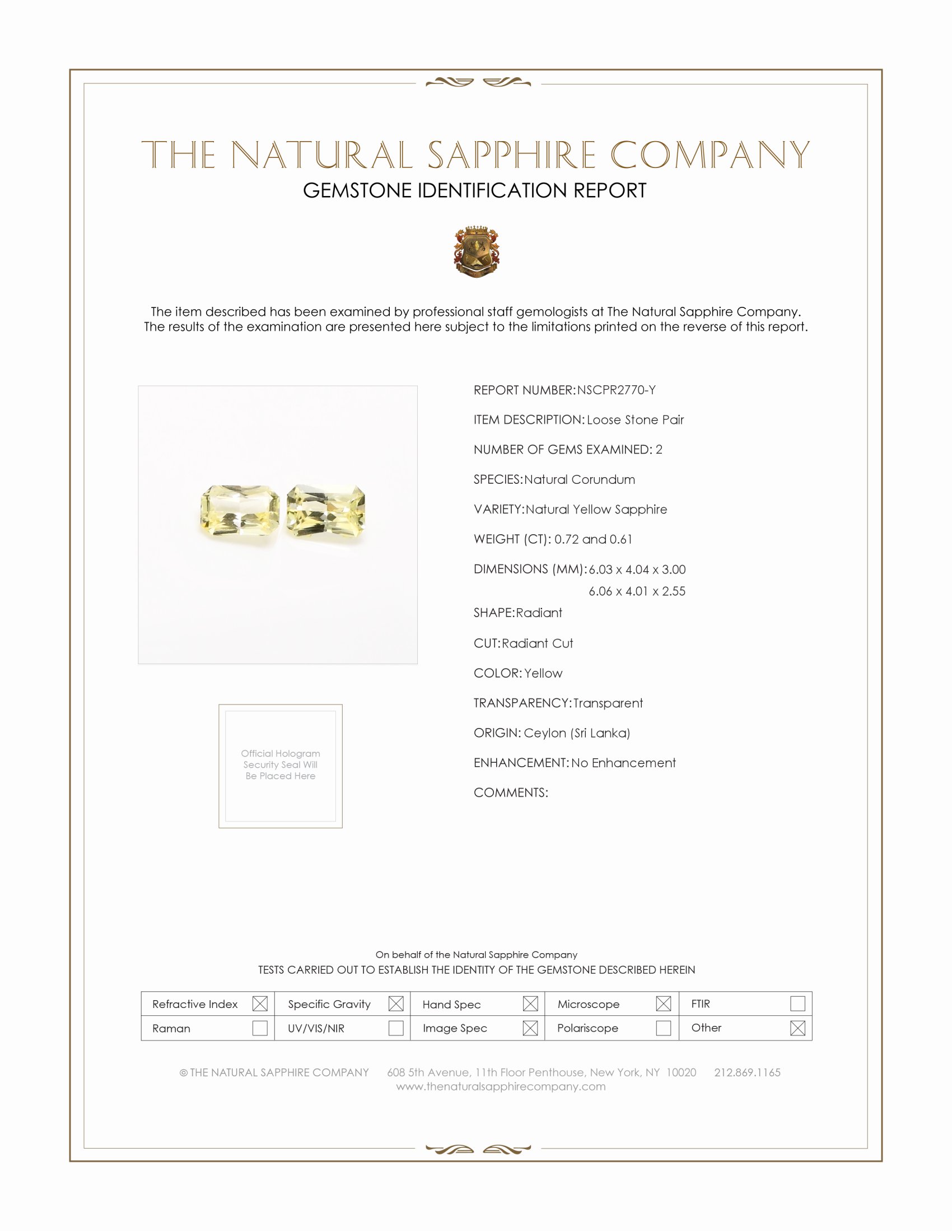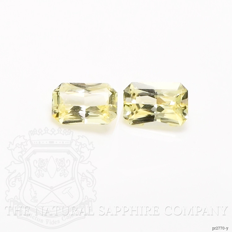 The earrings feature a beautiful, transparent pair of sapphires that are 1.33 total carat weight. They are radiant shape yellow sapphires, with the dimensions of 6.03 x 4.04 x 3.00 mm and are radiant cut, have a clarity grade of very slightly included (evaluated at eye level), medium light color saturation, and an excellent polish. The origin of this pair of sapphires is Ceylon (Sri Lanka).