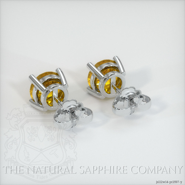 The earrings feature a beautiful, transparent pair of sapphires that are 1.59 total carat weight. They are round shape yellow sapphires, with the dimensions of 5.47 x 5.42 x 3.56 mm and are mixed brilliant cut, have a clarity grade of eye clean (evaluated at eye level), intense color saturation, and an excellent polish. The origin of this pair of sapphires is Ceylon (Sri Lanka).