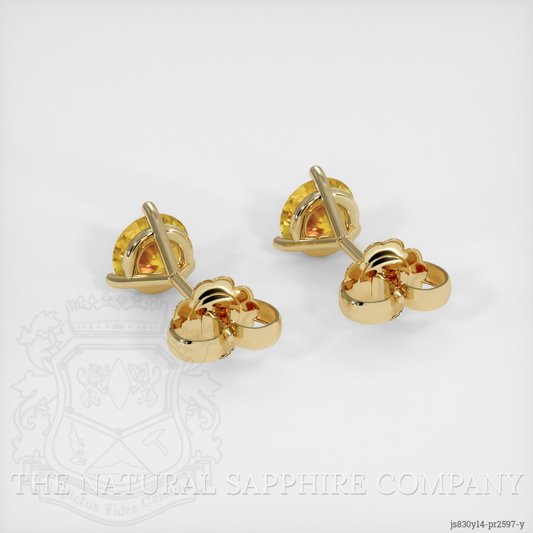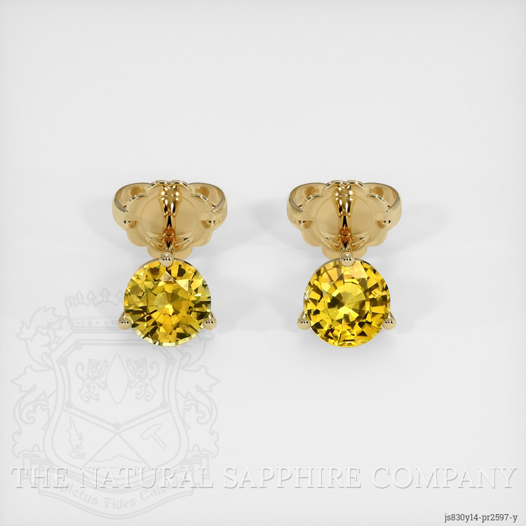 The earrings feature a beautiful, transparent pair of sapphires that are 1.59 total carat weight. They are round shape yellow sapphires, with the dimensions of 5.47 x 5.42 x 3.56 mm and are mixed brilliant cut, have a clarity grade of eye clean (evaluated at eye level), intense color saturation, and an excellent polish. The origin of this pair of sapphires is Ceylon (Sri Lanka).