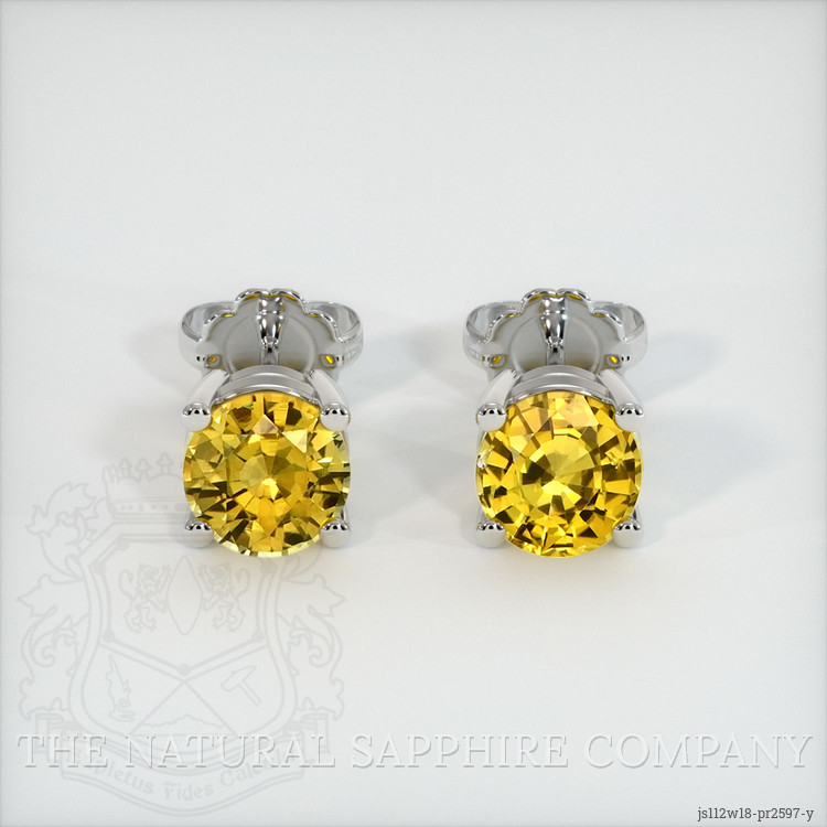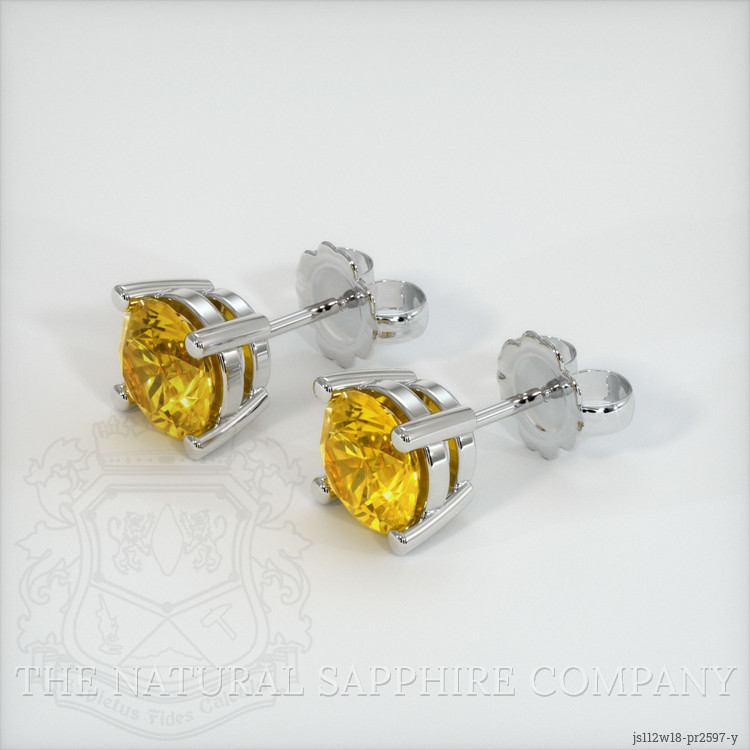 The earrings feature a beautiful, transparent pair of sapphires that are 1.59 total carat weight. They are round shape yellow sapphires, with the dimensions of 5.47 x 5.42 x 3.56 mm and are mixed brilliant cut, have a clarity grade of eye clean (evaluated at eye level), intense color saturation, and an excellent polish. The origin of this pair of sapphires is Ceylon (Sri Lanka).