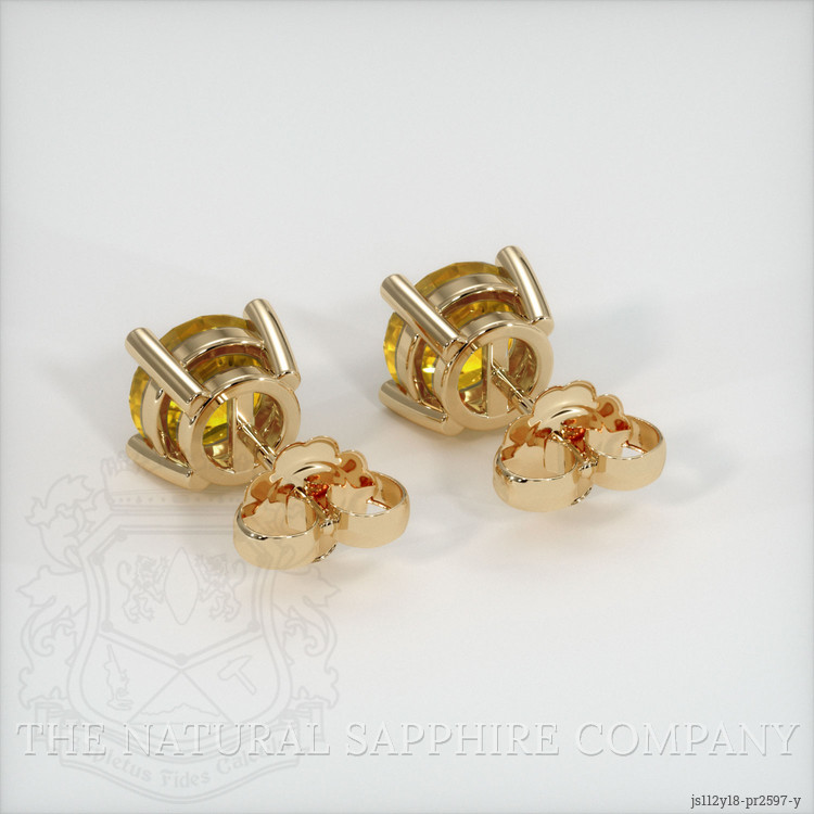 The earrings feature a beautiful, transparent pair of sapphires that are 1.59 total carat weight. They are round shape yellow sapphires, with the dimensions of 5.47 x 5.42 x 3.56 mm and are mixed brilliant cut, have a clarity grade of eye clean (evaluated at eye level), intense color saturation, and an excellent polish. The origin of this pair of sapphires is Ceylon (Sri Lanka).