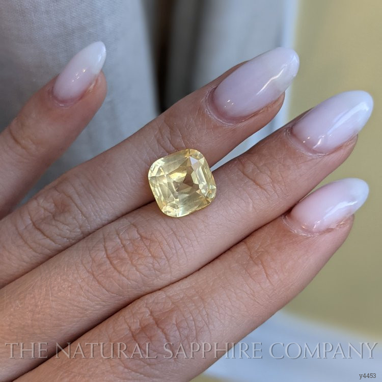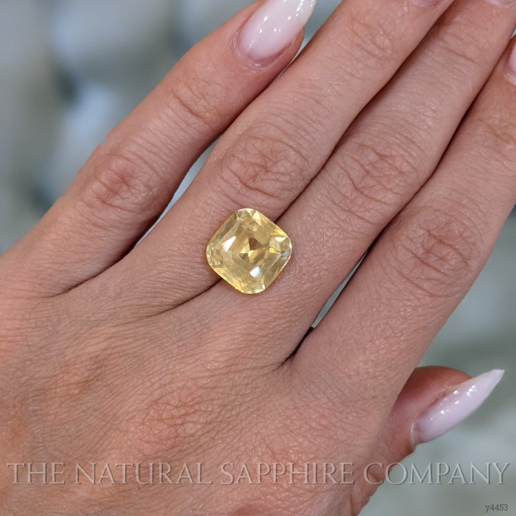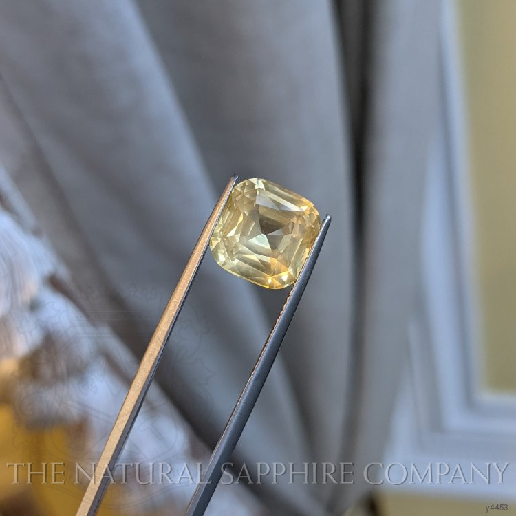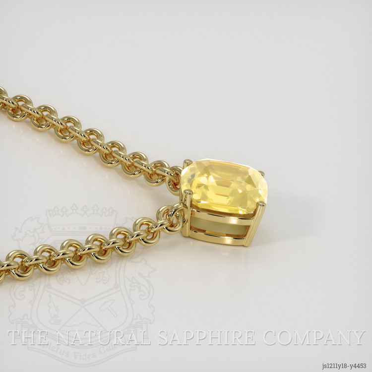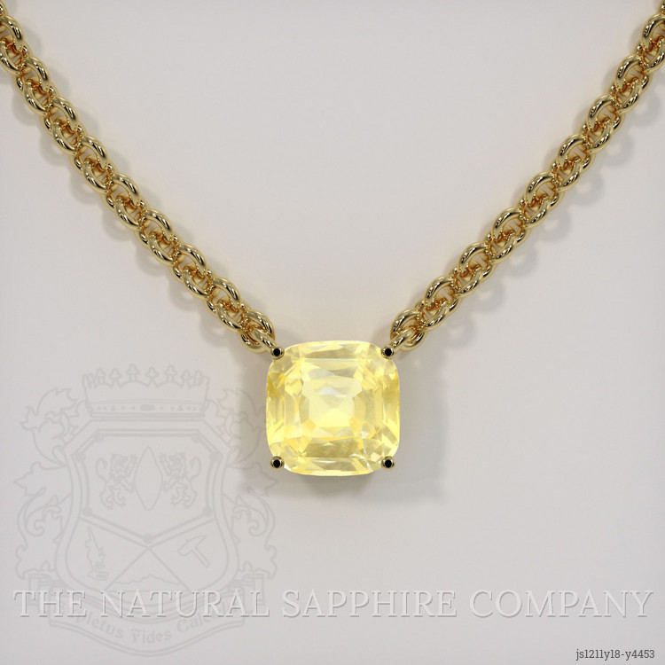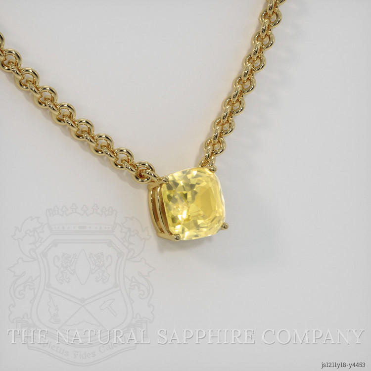 The necklace features a beautiful, transparent GIA certified Yellow 7.69 carat cushion shape yellow sapphire with the dimensions of 11.09 x 11.02 x 6.90 mm and a mixed brilliant cut. It has a clarity grade of eye clean (evaluated at eye level), medium intense color saturation, and an excellent polish. The origin of this sapphire is Ceylon (Sri Lanka).