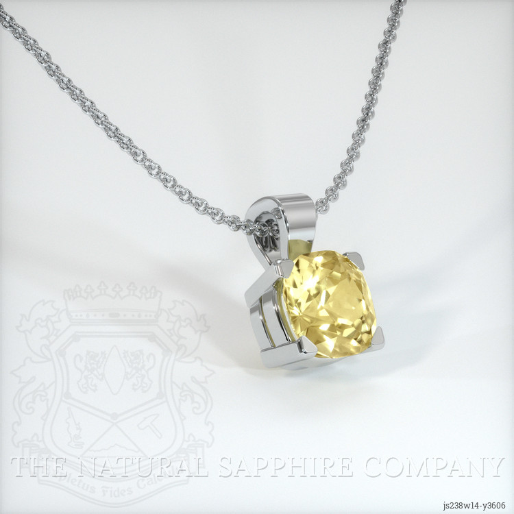 The pendant features a beautiful, transparent 1.02 carat cushion shape yellow sapphire with the dimensions of 6.01 x 5.97 x 3.87 mm and a mixed brilliant cut. It has a clarity grade of very slightly included (evaluated at eye level), medium intense color saturation, and an excellent polish. The origin of this sapphire is Ceylon (Sri Lanka).