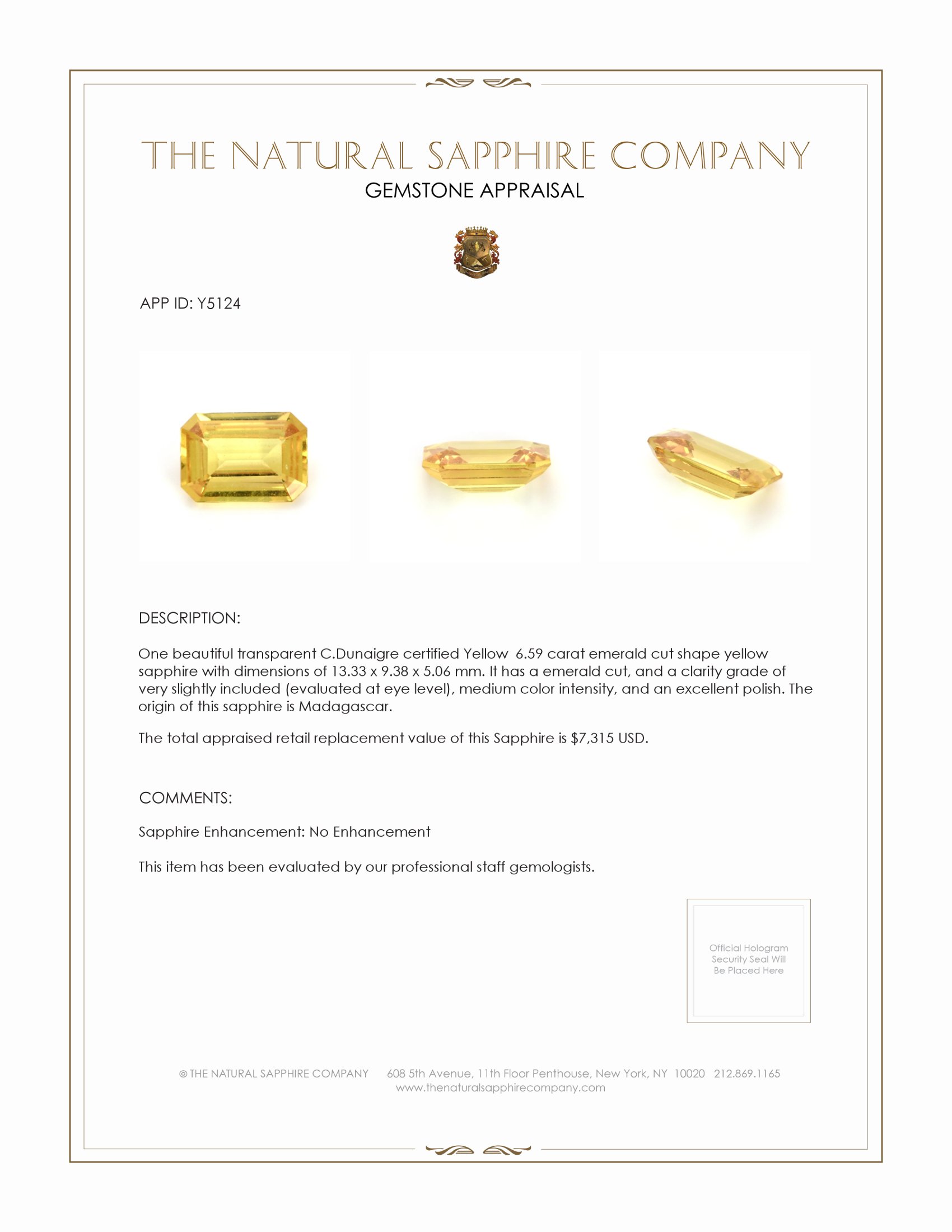 The pendant features a beautiful, transparent C.Dunaigre certified Yellow 6.59 carat emerald cut shape yellow sapphire with the dimensions of 13.33 x 9.38 x 5.06 mm and a emerald cut. It has a clarity grade of very slightly included (evaluated at eye level), medium intense color saturation, and an excellent polish. The origin of this sapphire is Madagascar.